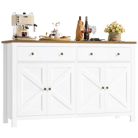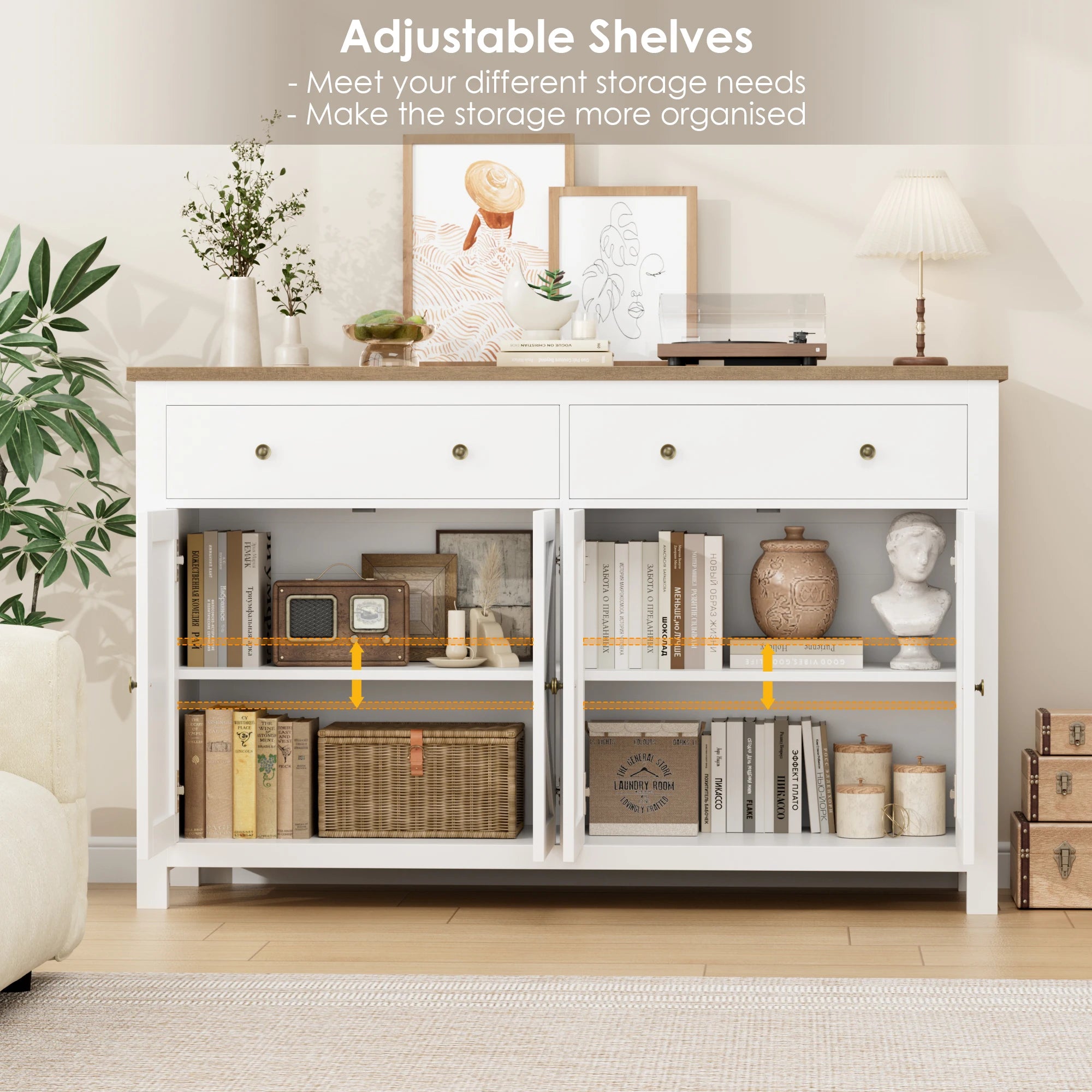 Mångsidigt förvaringsskåp — den harmoniska kombinationen av vit kropp och bordsskiva i ek gör denna enhet till ett snyggt TV-bord för vardagsrummet, ett sideboard för köket eller matsalen, eller ett konsolbord för hallen.