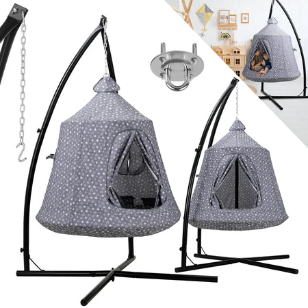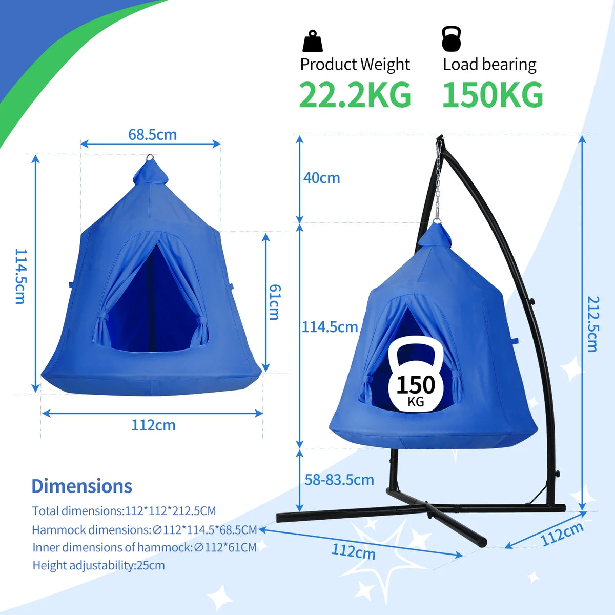 Oavsett om du skapar en mysig läshörna eller en lekfull utomhusoas, erbjuder detta Hanging Hammock X Stand With Tree Tent en härlig, lågstresslösning som kombinerar nöje med komfort och säkerhet.