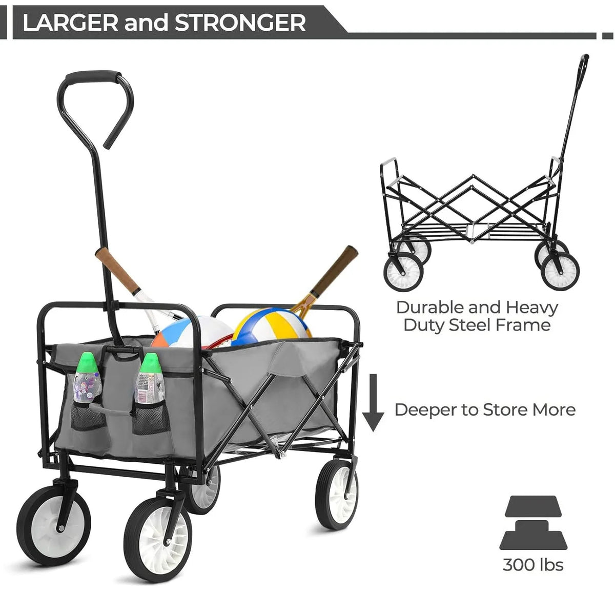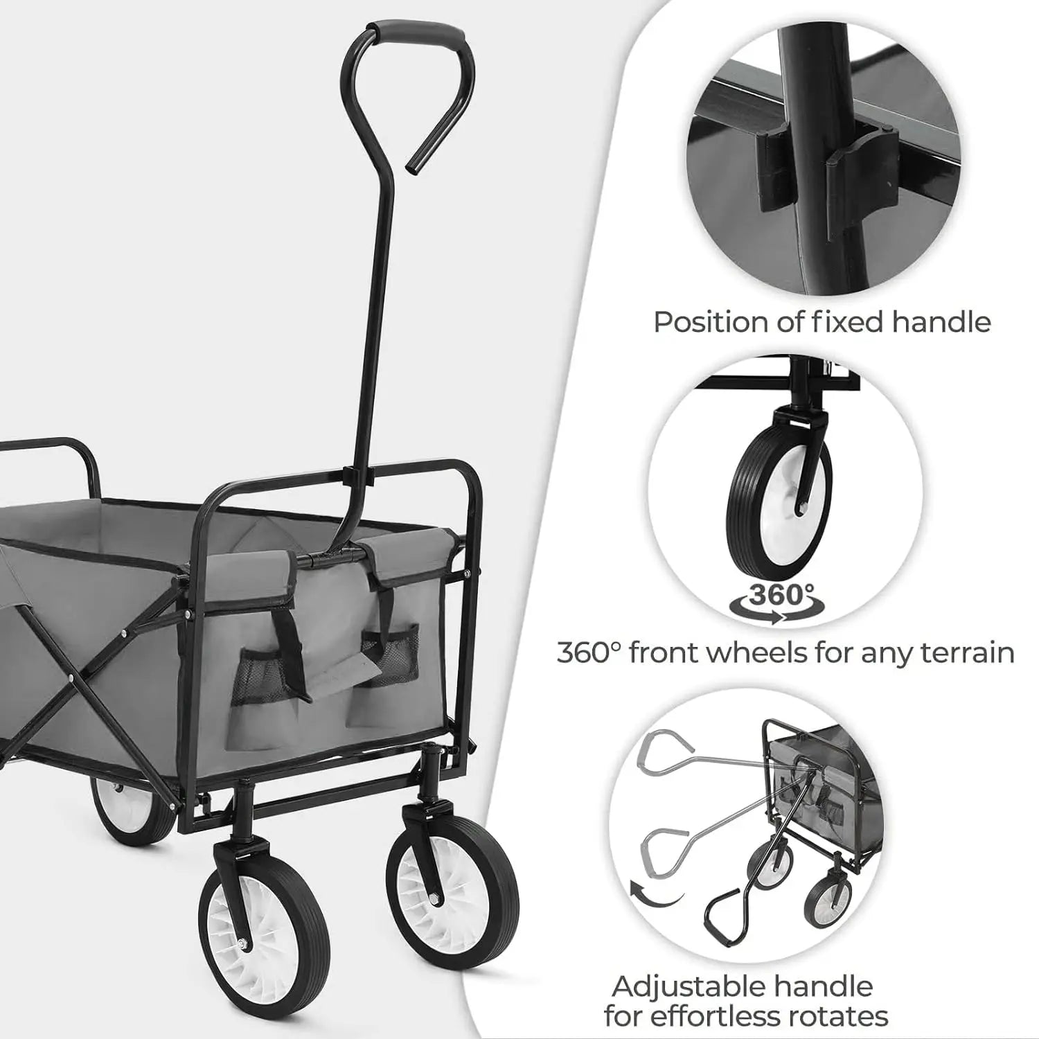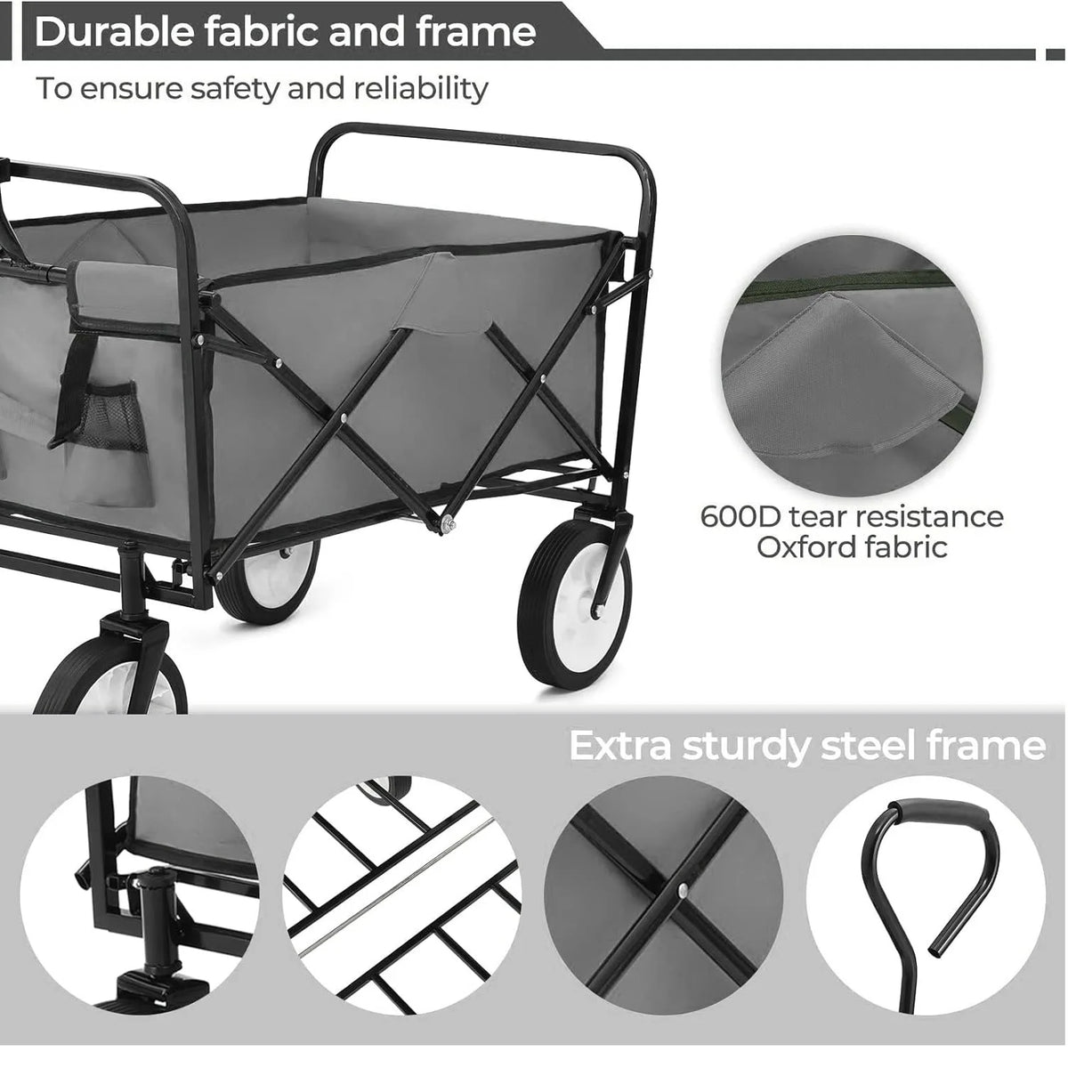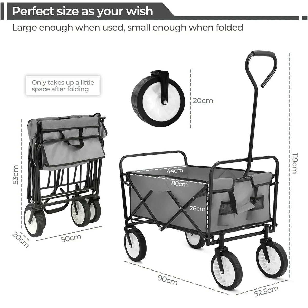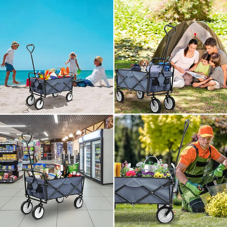 Möt Heavy Duty Foldable Wagon Cart Garden Utility Handcart — en robust, portabel transportlösning byggd för familjeutflykter, trädgårdsarbete, shoppingturer, stranddagar och camping. Med en stark järnram och ett vattentätt 600D-tygsliner klarar den upp till 80 kg och erbjuder en generös kapacitet på 110L. Ingen installation krävs; fäll bara ut för användning och fäll ihop för att spara plats. Hopfälld storlek är 30 x 20 x 8 tum, vilket gör förvaring i garage eller bilens bagageutrymme enkel. Denna vagn är en pålitlig partner för vardagliga ärenden och utomhusäventyr.