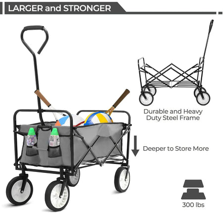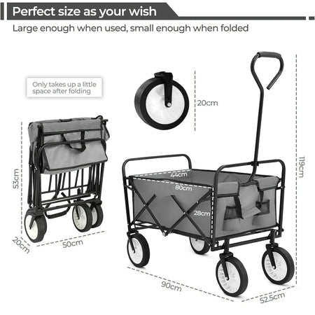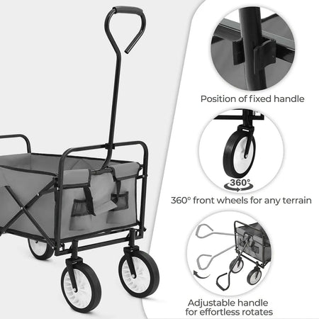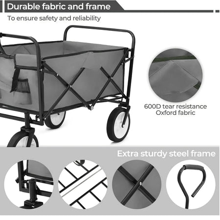 - Mångsidig design: använd som handvagn för utflykter, transportvagn för att flytta gods, trädgårdsverktygsvagn eller släpvagn för gräsklippare.
