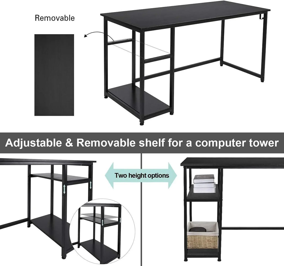 - Effektiv organisering: Använd de öppna hyllorna för dokument, anteckningsböcker, skrivare eller dekorativa detaljer för att minska skrivbordsstök.