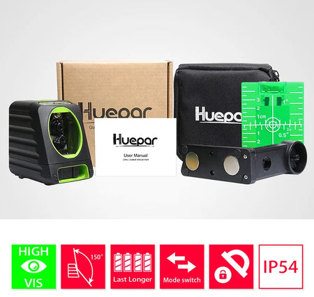 Huepar självnivellerande korslinjelaser med grön stråle, 150 graders utomhusbruk
