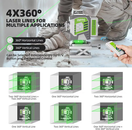 Huepar ZK04CG-L Grön Korslinjelaser, Självnivellerande, 16 Linjer, 8000mAh