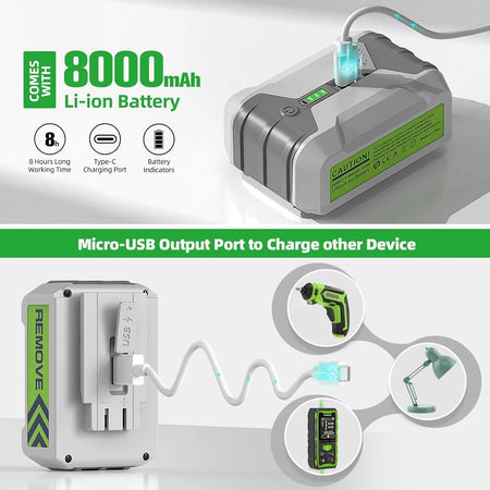 - Ström: 5 V, 2 A laddning; Batteri: 8000 mAh Li‑ion