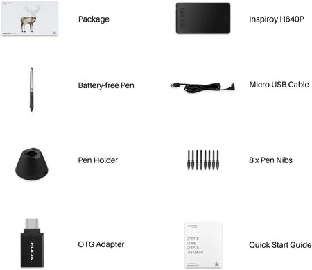 Designad för hållbarhet och daglig användning, Huion H640P har en hållbar, papperliknande yta med rundade hörn och en kantlös design för ett elegant utseende och bekväm hantering. Den väger bara 227 g och är endast 8 mm tjock, så den är lätt att ta med i din väska för konst på språng. Denna modell är kompatibel med Windows och Mac OS, och den levereras med en OTG-adapter för bekväm Android OTG-anslutning också.
