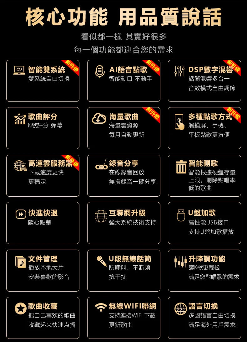 KD9MAX förvandlar hemmaträffar till KTV-kvällar i professionell stil. Med 4K-utgång och enkel åtkomst till över 600K låtar löser den installationskomplexitet och begränsade låtbibliotek—ger dig omedelbar, pålitlig karaoke som är enkel att använda och rolig för alla åldrar.