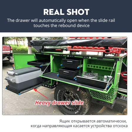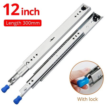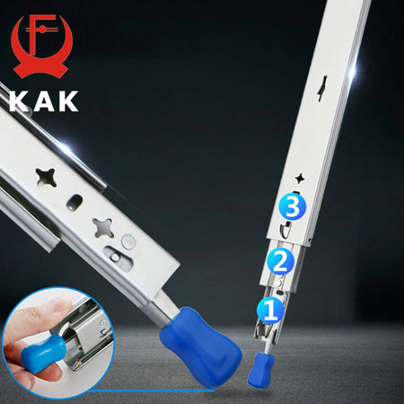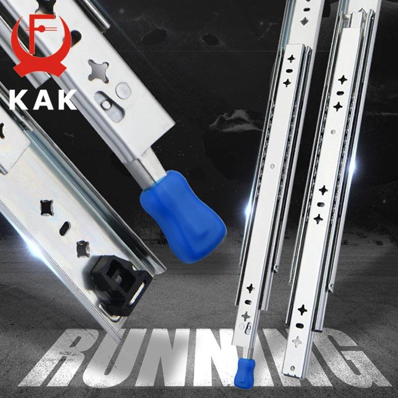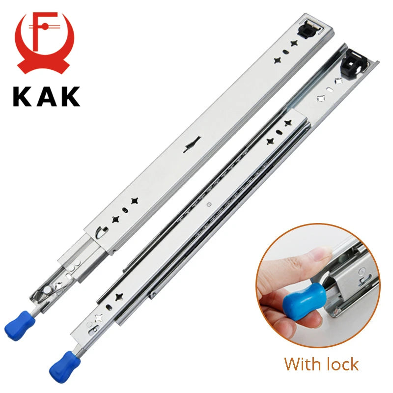 Möt KAK Kullagrade Lådräls med Lås, en kraftig skjutlösning designad för hållbar, tyst drift i skåp, lageranläggningar, finansiell utrustningsinkapsling och industriella lådor. Byggd för att hantera upp till 120KG, levererar dessa tre-sektionsskenor en mjuk, fullutdragsrörelse med en säker låsmekanism som förhindrar oavsiktliga lådfall. Den blåförseglade ytan ger överlägset rost- och oxidationsskydd, medan återstudsenheten utlöser automatisk öppning för enkel åtkomst. Njut av tyst prestanda med mjukstängning och ljuddämpande funktioner, inget ljud och robust slitstyrka som håller lådorna i linje och redo för daglig användning.