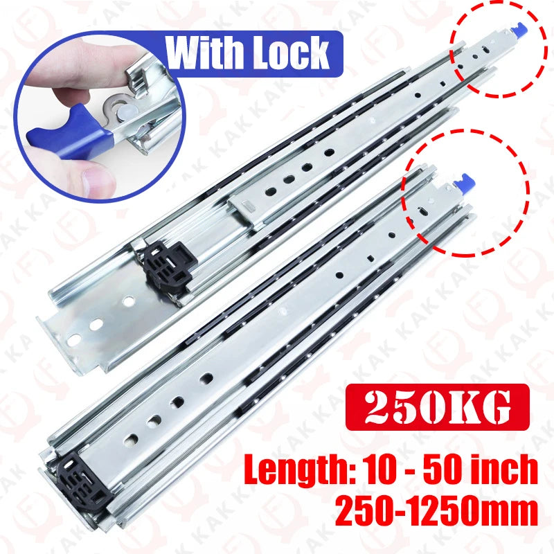 Introducerar KAK Heavy Duty Lådskena med lås och mjukstängning 551 lb — byggd för att hantera krävande arbetsbelastningar med enkel, tyst drift. Klassad för upp till 250 kg (551 lbs), levererar dessa tresektionsskenor full utdragning, smidig rörelse och en mjukstängningsfunktion som förhindrar smällar och minskar slitage på dina lådor. Lås-in och lås-ut utlösaren håller innehållet säkert på ojämna eller tuffa ytor, vilket gör dem idealiska för underbricka UTE-lådor, stora camper trailer-lådor och tunga lastlådor i din 4x4.