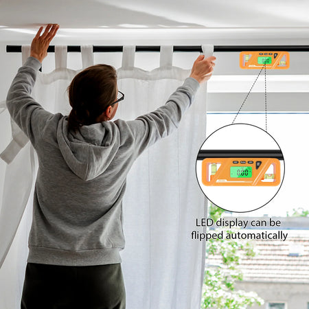 Med en stor LCD-display och bakgrundsbelysning kan du läsa mätningar tydligt i mörka utrymmen. HOLD-funktionen låser data för enkel registrering, medan 360° mätkapacitet och 4 × 90° intervall ger flexibilitet för alla vinkeluppgifter. Den kompakta, fickvänliga storleken (130 × 57 × 36 mm) och den lätta vikten på 66 g gör den idealisk för användning på jobbet och vid resor. Den magnetiska designen gör att den kan fästa säkert på metallytor som skrivbord, geringsågar, bandsågar och bordsågsblad, vilket håller dina händer fria för noggrann uppställning.