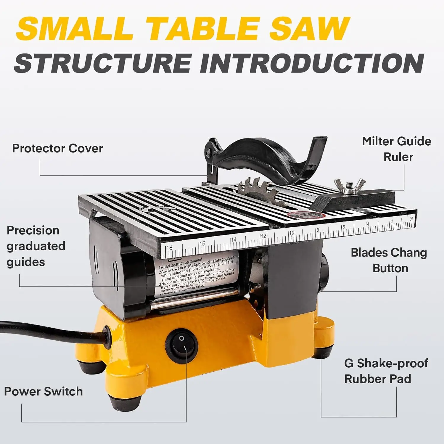 Portabel överallt: Denna lilla bordsåg är kompakt och portabel, med måtten endast 7,5 tum i längd x 5,5 tum i bredd x 4,7 tum i höjd. Den är utrustad med fyra gummidämpande fötter, som förhindrar glidning, minskar stötar och sänker ljudnivån under kapning. Du kan enkelt slutföra installationen. Oavsett om du gör hantverk inomhus eller genomför utomhus DIY-projekt, kan denna bordsåg tjäna dig när som helst och var som helst.