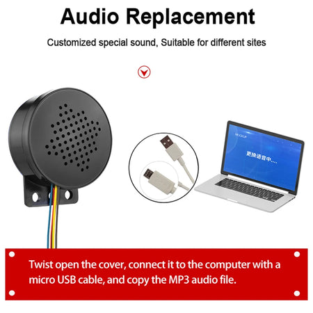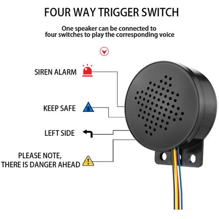 Den flexibla aktiveringen är idealisk för tunga applikationer och erbjuder fyra 4-vägsutlösare som fungerar med hög- eller låg-nivåsignaler för enkel installation på industrimaskiner, jordbruksutrustning och påminnelsesystem. Utöver varningspip fungerar den även som ett navigationshorn eller plats-specifik röstprompt genom att ladda anpassade MP3-ljud.