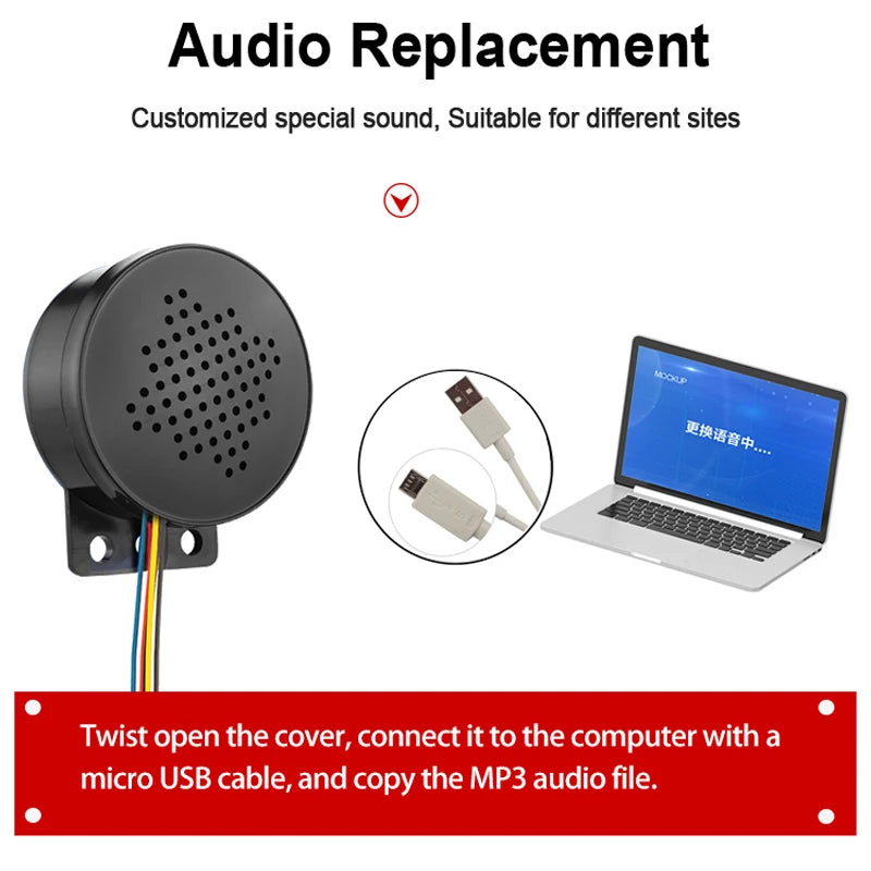 Ljudanpassning är enkel och praktisk: enheten inkluderar 4MB flashminne och stödjer MP3-filer som laddas ner via USB. Skapa ett dedikerat ljudbibliotek genom att placera ljudfiler i en mapp som heter “00” på ett USB-minne, och anslut sedan igen för att spela de valda promptarna. Flera språk stöds med varierande rösteffekter för att passa olika användningsscenarier.
