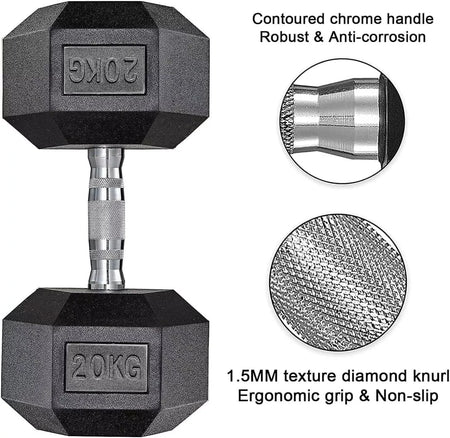 Uppgradera din träning med Hexagon Dumbbell Set, ett premiumpar designat för studioträning och effektiva hemmagympass. Finns i 10 kg, 20 kg eller 25 kg per hantel, detta set har en hexagonal form som motverkar rullning och skyddar golv. Den robusta gummibeläggningen är hållbar, hudvänlig och lätt att torka av, medan de ergonomiska krompläterade handtagen ger ett säkert och bekvämt grepp för alla lyft.