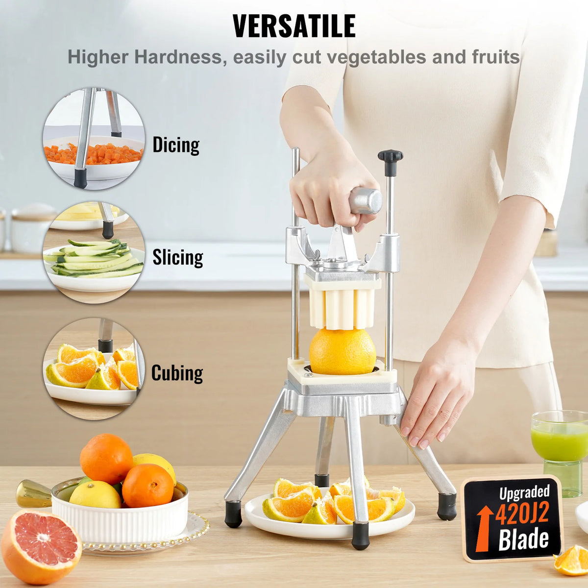 - Spara tid med snabba, jämna snitt för potatis, morötter, gurkor, äpplen och mer – utmärkt för sallader, pommes frites och förberedelsearbete.