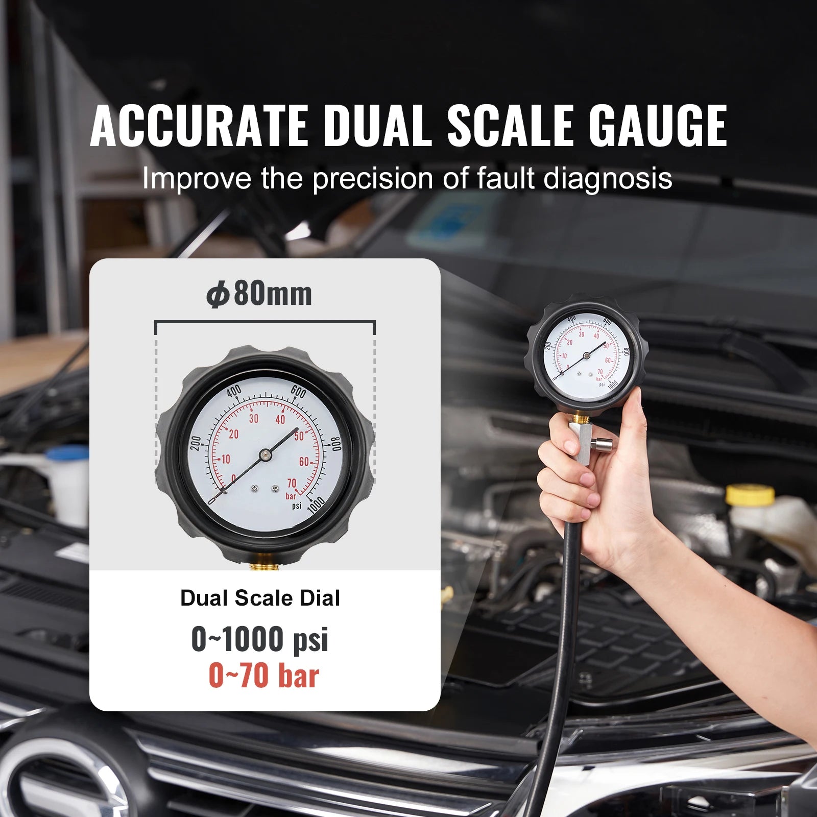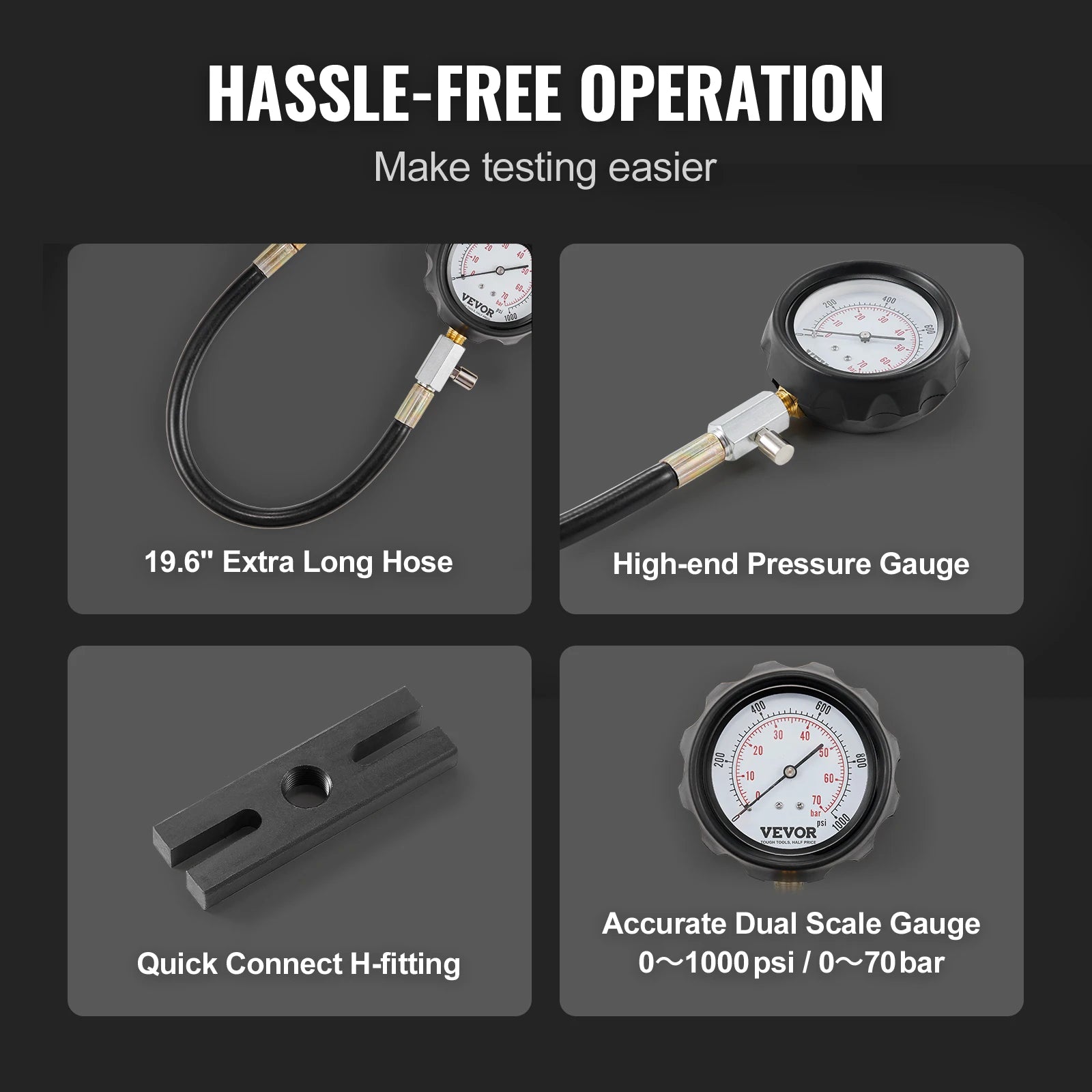 - Bedöm snabbt motorns hälsa med precisa, dubbelskala avläsningar från 0-1000 psi (0-70 bar).