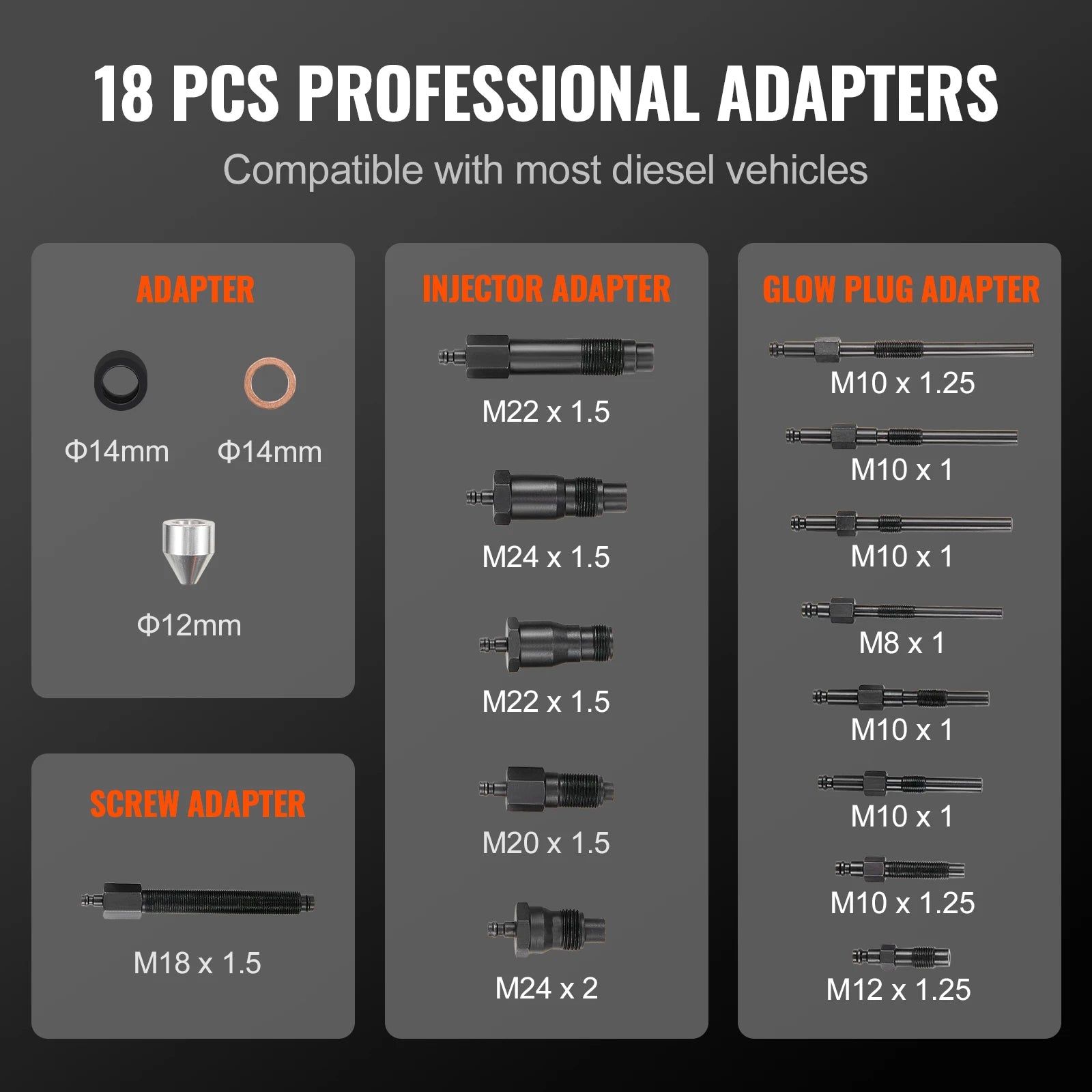 18 adaptrar ger bred kompatibilitet för dieselmotorer i bilar, lastbilar, traktorer, motorcyklar och andra vanliga dieselplattformar, vilket gör detta till ett mångsidigt tillskott i varje verkstad eller hemmagarage.