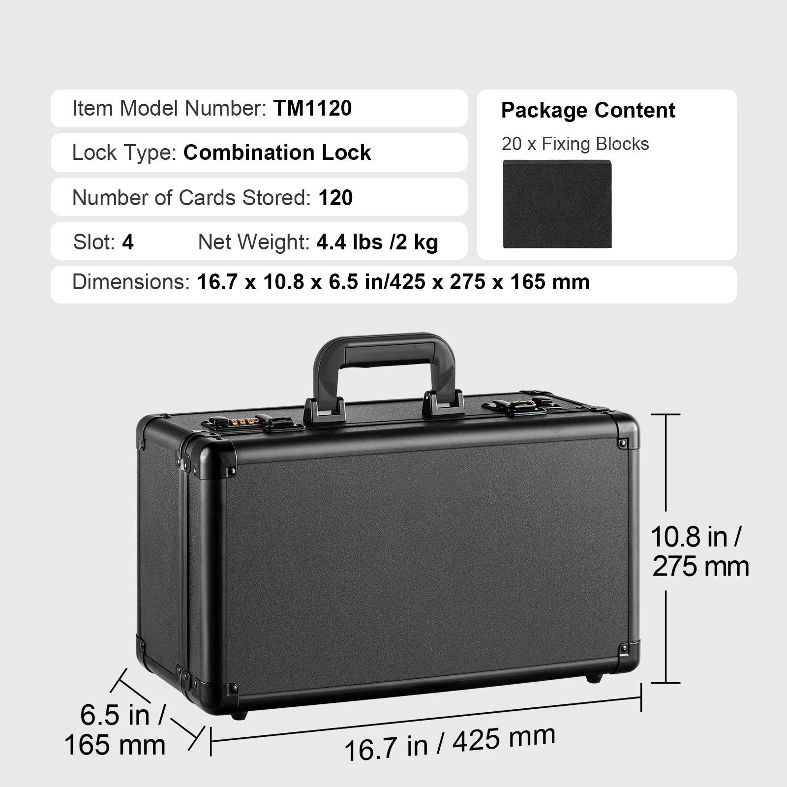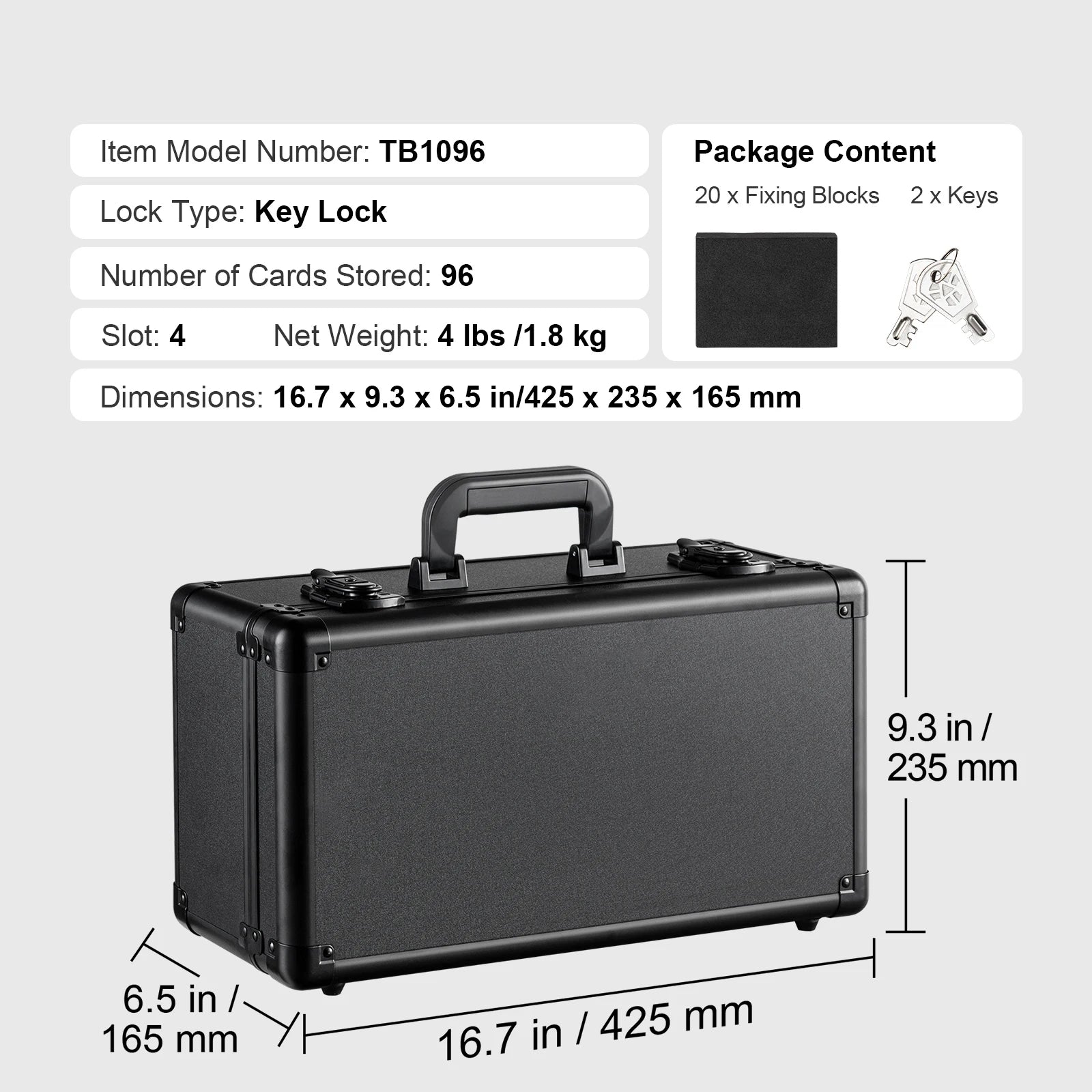 - Låsalternativ: Nyckellås (med 2 nycklar) för 96-kortsmodellen; kombinationslås för 108/120 och 162-kortsmodellerna