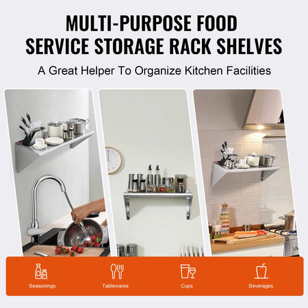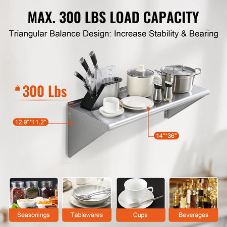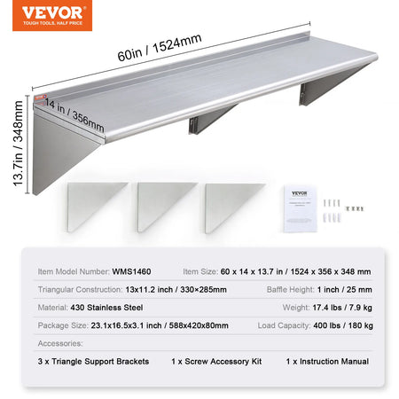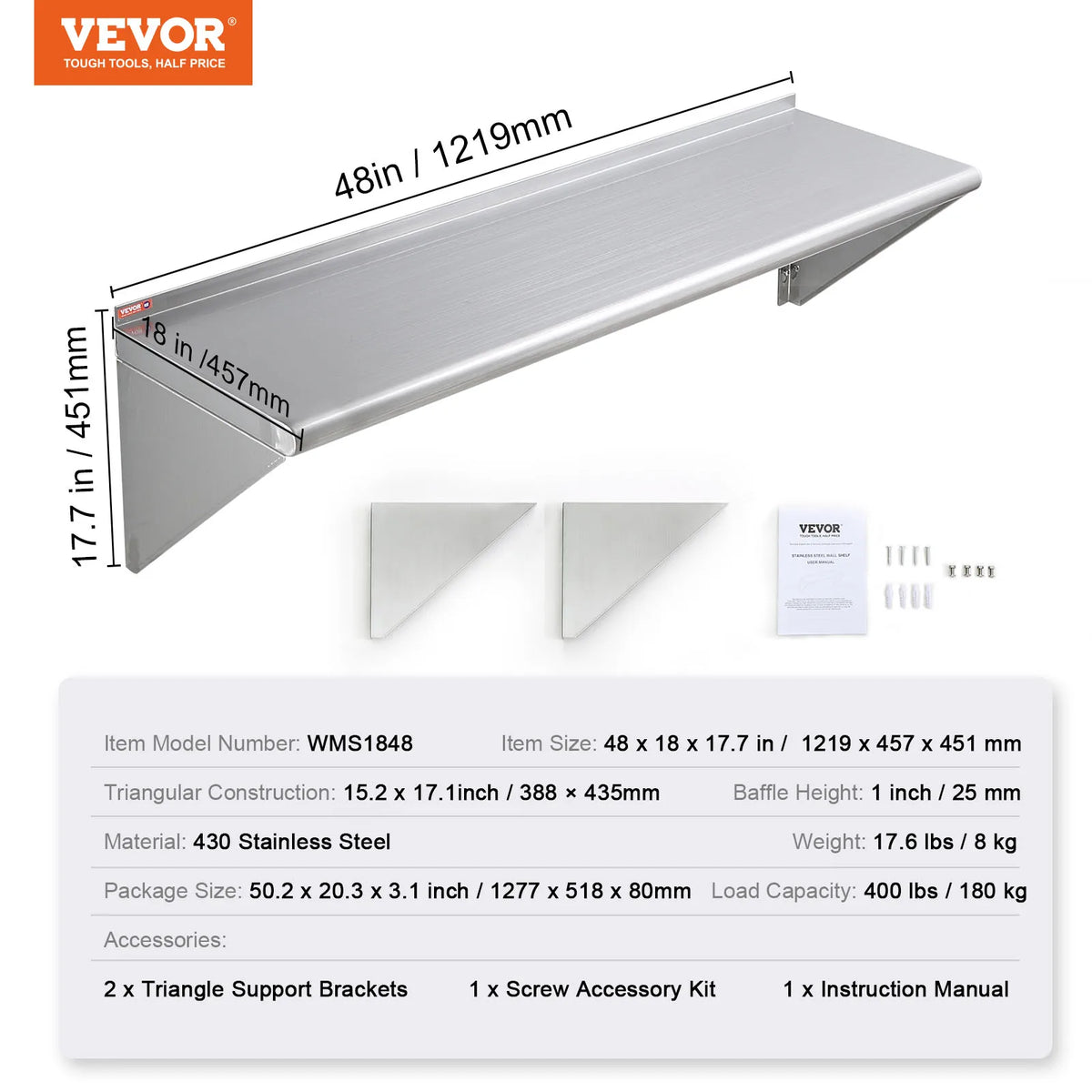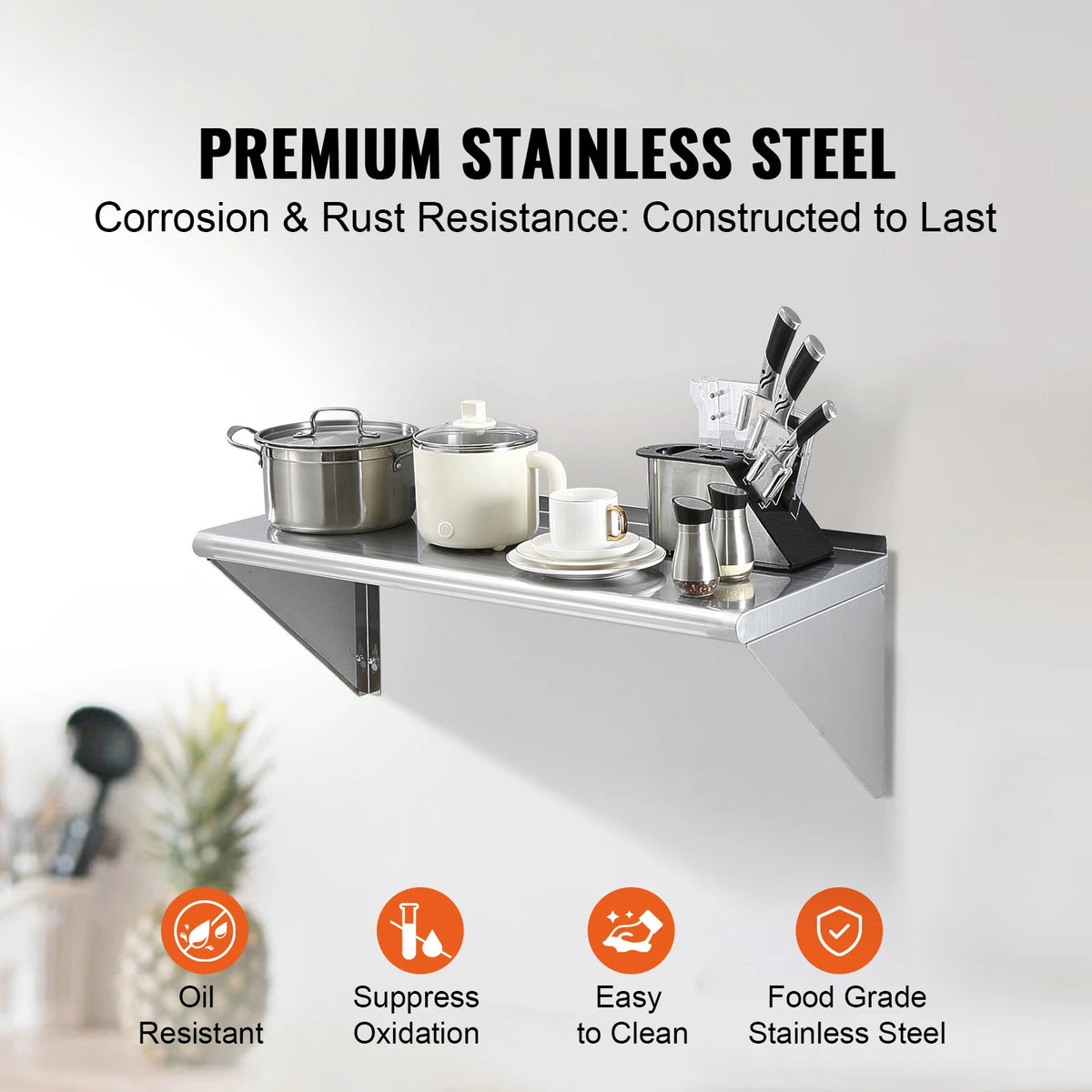 Upptäck den väggmonterade flytande hyllan i rostfritt stål med tungt lastningsrack från succebuy — en hållbar, platsbesparande lösning designad för hektiska kök, restauranger och verkstäder. Tillverkad av 430 rostfritt stål med en borstad yta, erbjuder den professionell styrka, enkel rengöring och en snygg, modern look. Den NSF-certifierade ytan motstår dagliga repor, korrosion och missfärgning, vilket gör den perfekt för matberedningsområden och miljöer med hög trafik. Med en robust triangulär konstruktion stöder denna vägghylla upp till 300 lbs (136 kg), vilket ger dig pålitlig förvaring för tunga kryddor, köksredskap, verktyg eller förnödenheter. De släta kanterna och den inbyggda stänkskyddet skyddar händerna och håller spill under kontroll, medan den öppna designen håller föremål inom räckhåll för snabbare service och bättre organisation. Snabb att installera med komplett hårdvara, hjälper den dig att sluta slösa utrymme och börja organisera på några minuter. Finns i fyra praktiska storlekar för att passa ditt utrymme: 14x48, 14x60, 18x48 och 18x60 tum. Lita på en lösning designad för kommersiellt bruk och daglig pålitlighet — perfekt för kök, sovrum, garage, tvättstugor och mer. På intercyprus.com sedan 2002 — betrodd för kvalitet och pålitlighet.