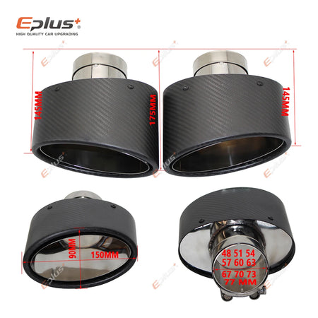 Designad för universell passform, rymmer denna dämpartipp en mängd olika avgasrör tack vare flera alternativ för ingångsdiameter och en generös svansstorlek. Den djärva 150 mm ovala utloppen skapar en distinkt silhuett som förbättrar din bils bakparti, oavsett om du kör på stadens gator eller ger dig ut på landsvägen. Installationen är enkel, och den lätta kolfiberkonstruktionen ger hållbarhet med en raffinerad look.