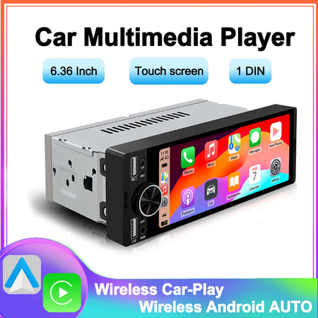 Uppgradera ditt fordon med den universella 6,36-tums 1DIN bilradion med trådlös CarPlay och Android Auto. Denna kompakta huvudenhet passar en standard 1DIN instrumentbräda och erbjuder en modern infotainmentupplevelse med en ljus, responsiv pekskärm och sömlös smartphoneintegration. Njut av bekvämligheten med trådlös CarPlay och Android Auto för navigation, samtal, meddelanden och musik—direkt från din telefon, med minimal distraktion på vägen.