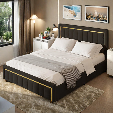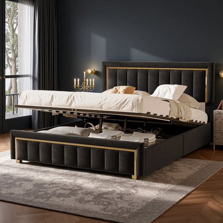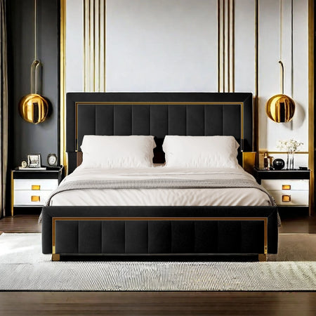 Upplev lyx och praktisk förvaring med Urban Luxe Velvet Upholstered Storage Bed i en elegant svart finish på 140x200 cm. Denna säng blandar klassisk och modern estetik med en förfinad vertikal design, förgyllda ringdetaljer och mjuka linjer som höjer stämningen i vilket sovrum som helst. Den djupa svarta sammetsytan tillför en mjuk, inbjudande känsla samtidigt som den levererar en exklusiv look som förblir tidlös natt efter natt.