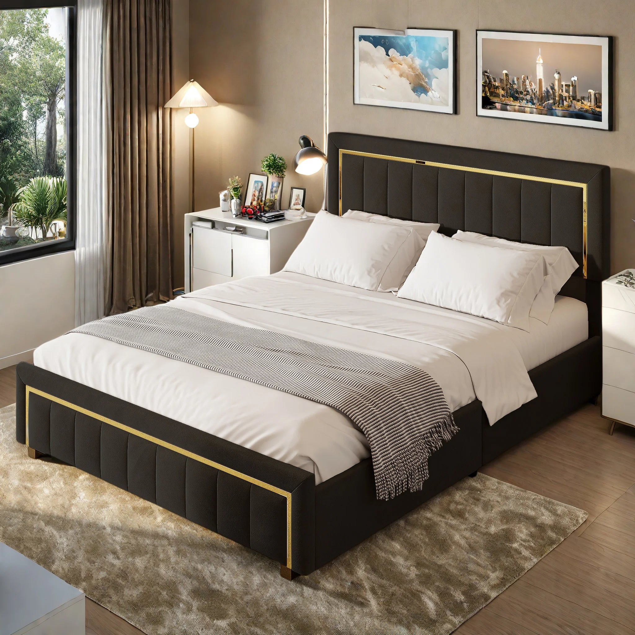 Smart förvaring möter vardagskomfort. Sängen har ett generöst förvaringsutrymme under sängen, lättillgängligt för att hålla säsongskläder, extra filtar eller oreda undan och utom synhåll. En robust plattstödd ram fördelar vikten jämnt för stabilt stöd, medan den vadderade sänggaveln ger bekvämt ryggstöd för läsning eller avkoppling före sömn. Den minimalistiska moderna silhuetten är designad för att smidigt passa med en rad inredningar – från skandinaviskt lugn till samtida lyx.