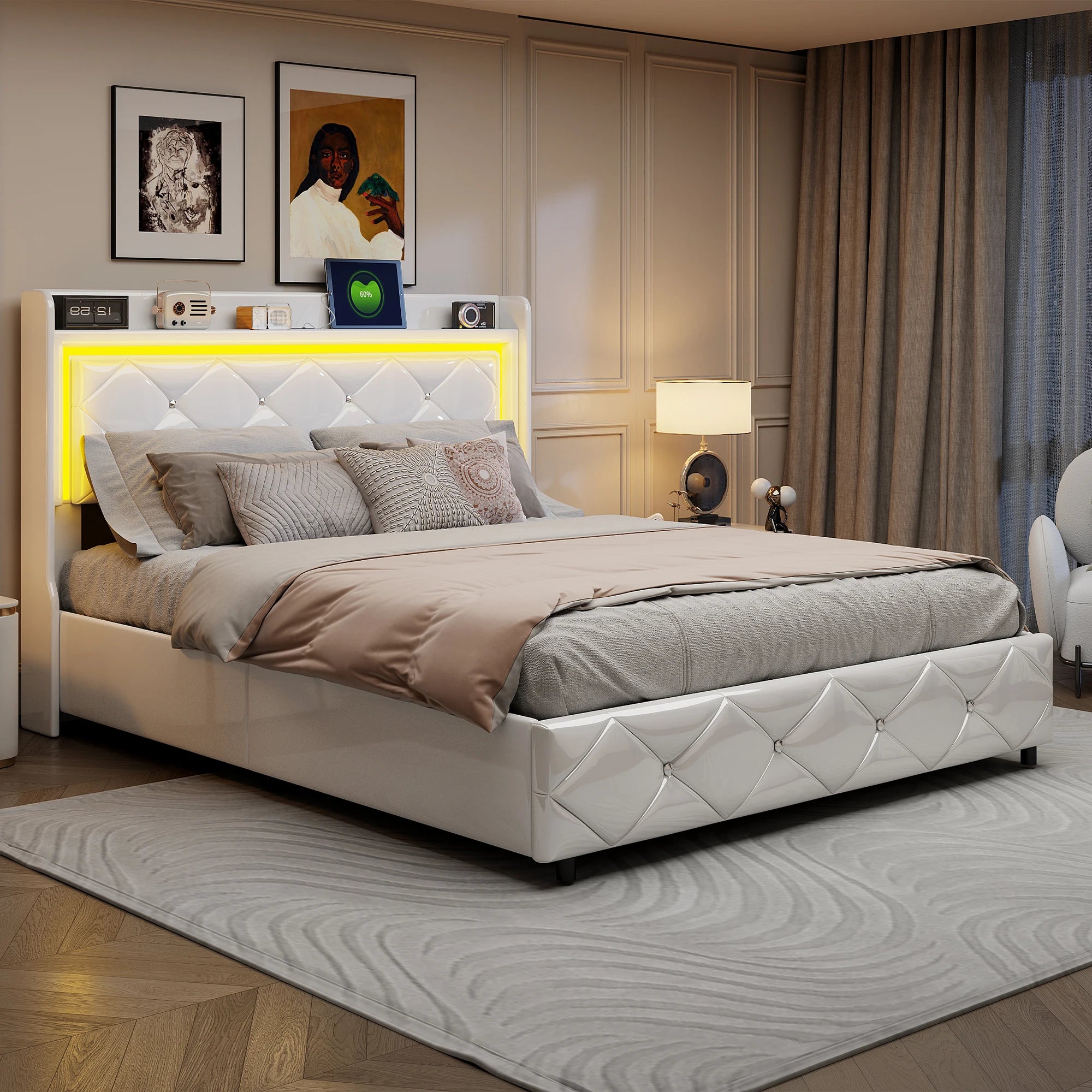 Höj ditt sovrum med Urban Luxe stoppade säng 140x200 LED-list och förvaring. Denna förfinade säng kombinerar mjukt vitt PU-läder med en kristallaccent på sänggaveln, vilket ger en touch av lyx och en ren, modern silhuett till vilket sovutrymme som helst. Sänggavelns område har en varm LED-ljusramp som ger ett mjukt ljus, perfekt för avkoppling eller sena kvällars läsning. En inbyggd USB-laddningsport på sängsidan, plus en europeisk laddare, håller dina enheter laddade utan att du behöver lämna sängen. Den smarta dolda förvaringen under sängen använder en lufttrycksstång för enkel åtkomst till sängkläder, kläder eller andra nödvändigheter, vilket hjälper dig att maximera utrymmet i mindre rum. Designen med plattbäddshållare fördelar kroppstrycket jämnt och främjar god luftcirkulation för en hälsosammare nattsömn. Tillverkad av MDF, metall och PU, erbjuder denna säng hållbarhet och långvarig komfort. Kompatibel med madrassstorlek 140x200 cm (madrass ingår ej). Ursprung: Fastland Kina.