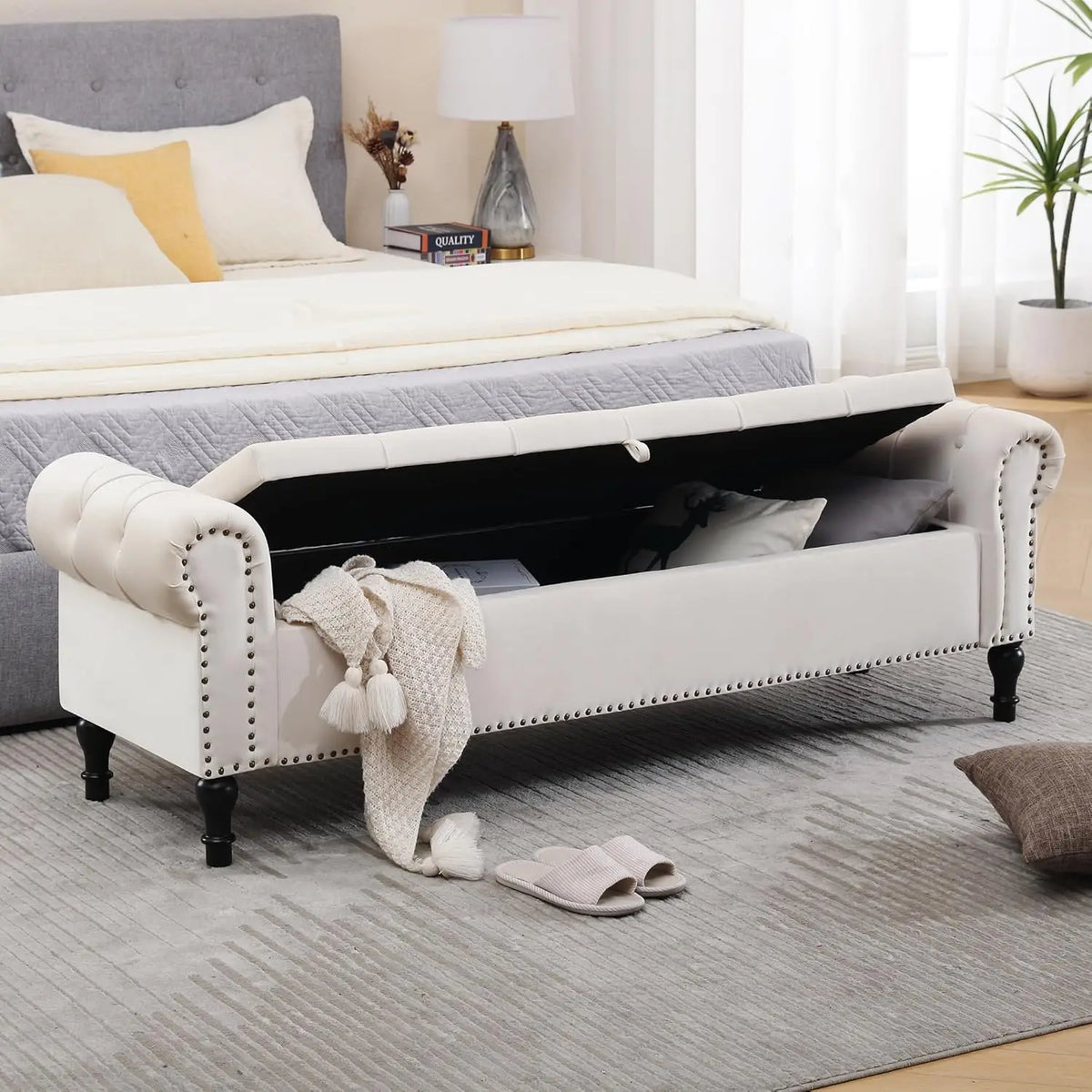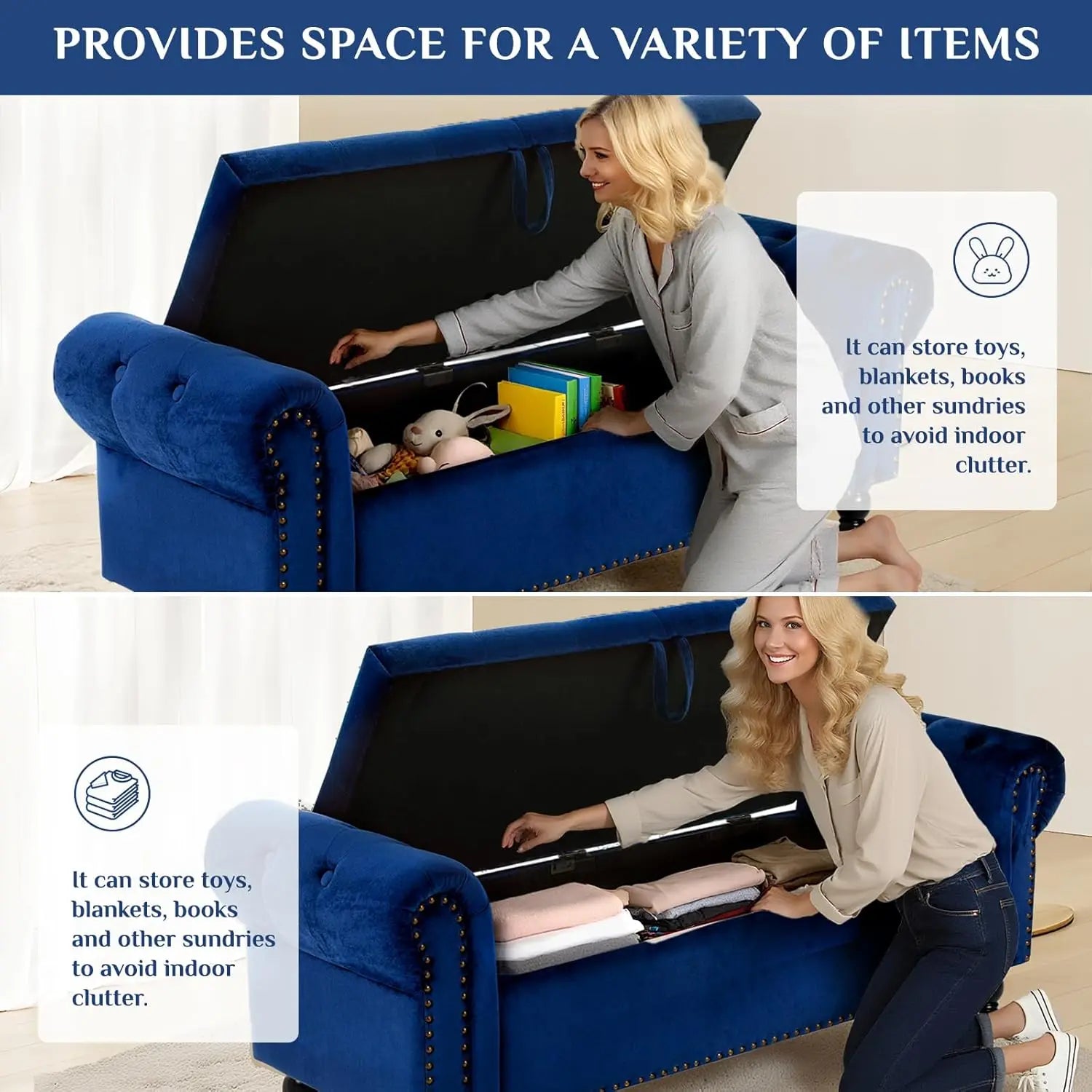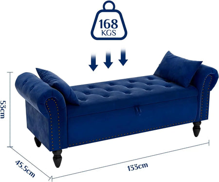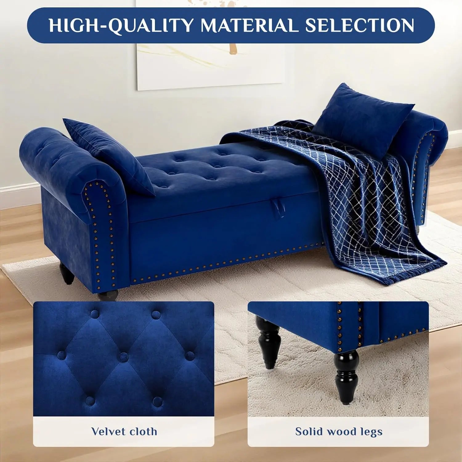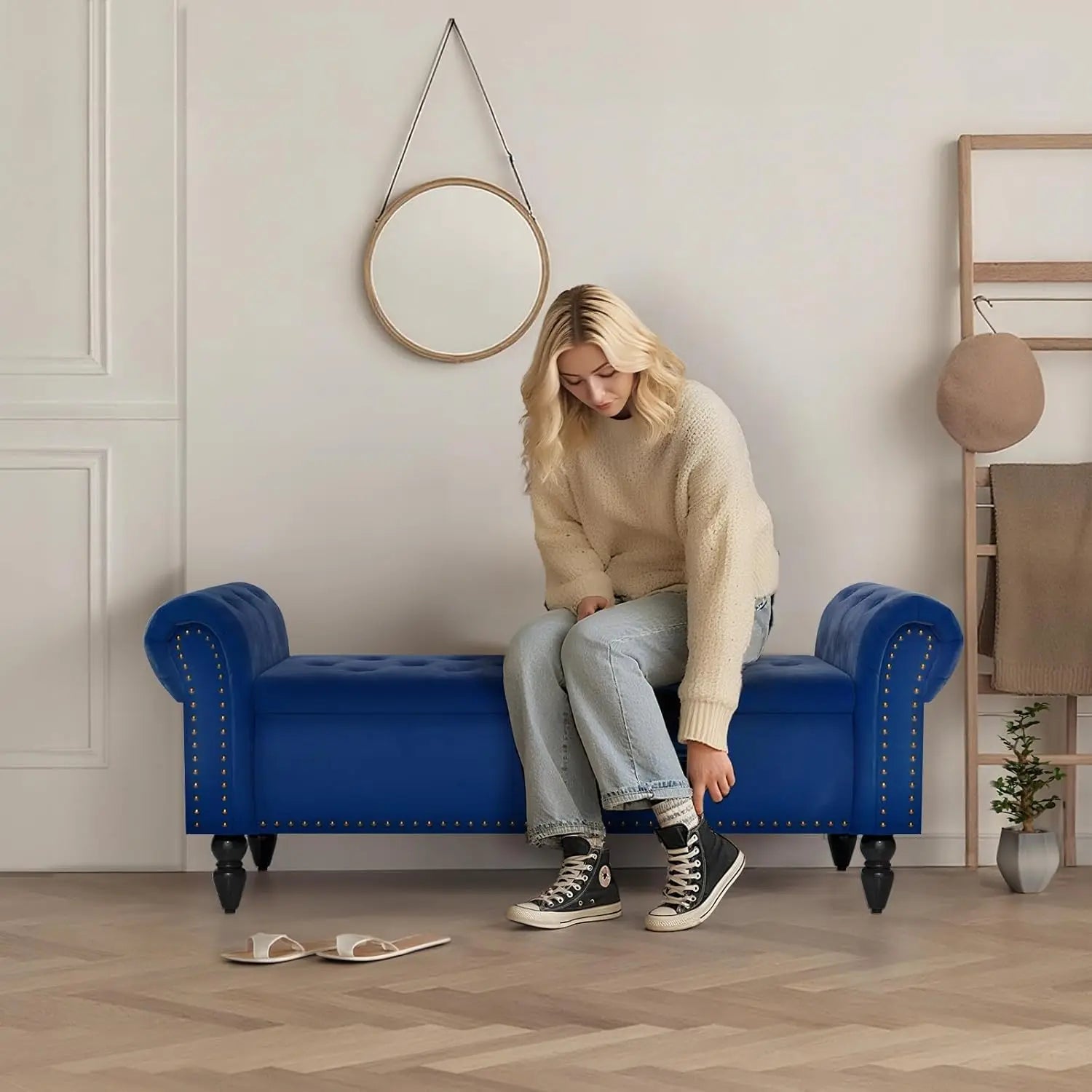 Sammet Förvaringsbänk Med Knappad Ottoman Och Armstöd Fotända
