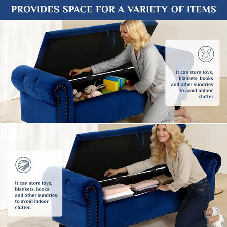 Velvet Storage Bench 133CM kombinerar modern minimalism med praktisk förvaring och levererar en stilren ottoman i slutet av sängen som förbättrar vilket sovrum, vardagsrum eller hall som helst. Klädd i premium sammet med tuftat lock och diamond stitch-detaljer, tillför denna bänk en touch av sofistikering samtidigt som den erbjuder generöst dold förvaring för böcker, filtar, leksaker eller kuddar. De rullade armstöden med nitar och en ram i massivt trä ger ett tidlöst, exklusivt utseende som passar sömlöst med modern inredning. Ett säkerhetsgångjärn förhindrar smällar och en robust konstruktion i flerskiktat trä stödjer daglig användning med förtroende. Lätt att montera på cirka 10 minuter, den är redo att ge komfort, ordning och elegans till ditt utrymme.