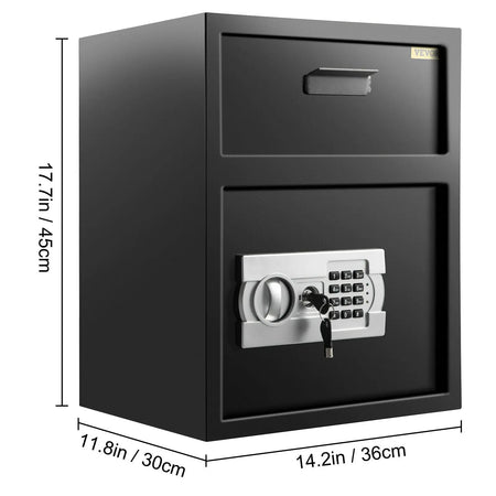 Skydda dina värdesaker med VEVOR Elektroniskt Värdeskåp med Insättningslucka och Nycklar. Tillverkat av högkvalitativt kolfiberstål, är detta hållbara värdeskåp byggt för att klara av daglig användning i hem eller små kontor. Den dedikerade insättningsluckan låter dig säkert släppa ner kontanter, dokument eller små föremål utan att öppna huvudfacket, vilket ökar säkerheten och effektiviteten i hektiska miljöer. Med inkluderade nycklar och pålitlig konstruktion får du snabb åtkomst när det behövs samtidigt som känsligt innehåll skyddas. Med ursprung från Fastlandskina och stödd av CE-certifiering, förenar detta värdeskåp praktisk säkerhet med betrodd pålitlighet.