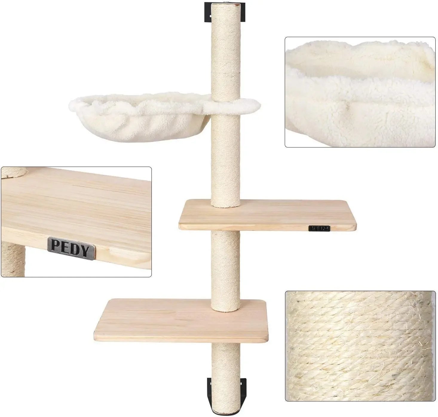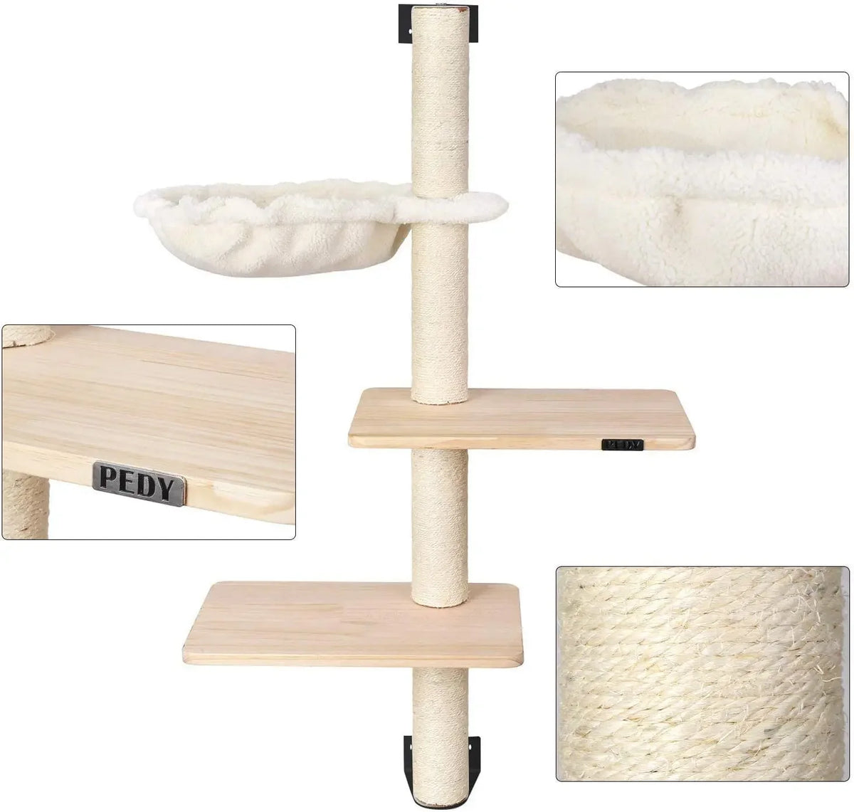 Introducerar Wall Mount Cat Scratcher Three Tier Pedy Sisal Plush 104cm, en smart, platsbesparande lekplats som passar snyggt på vilken vägg som helst. Tillverkad av trä, plast, sisal och mjuk plysch, erbjuder denna trevånings klösbräda en tillfredsställande yta för klös, klättring och vila – allt i en kompakt enhet. Du väljer höjden på klösstolpen på väggen, så att den passar ditt rum och din katts preferenser.