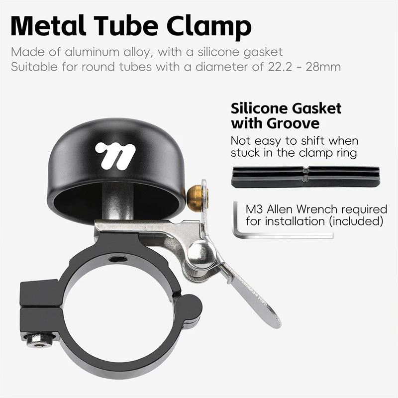 Tillverkad av koppar med en kropp i aluminiumlegering, är klockan byggd för att tåla daglig användning på olika cyklar. Den passar styrstångsrör med en diameter på 22,2–28 mm, vilket gör den till en mångsidig uppgradering för de flesta styrstänger. Den medföljande M3 insexnyckeln gör installationen snabb och enkel, så att du kan njuta av den retrostilen och det pålitliga ljudet direkt. Den svart/silverfärgade finishen ger ett subtilt, tidlöst utseende som kompletterar både moderna och vintagecyklar.