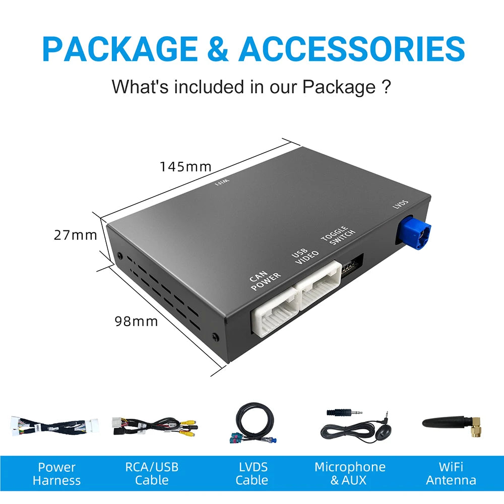 Specifikt designad för Chrysler 300-serien från 2011 till 2016, lägger detta retrofittkit till trådlös och trådbunden CarPlay tillsammans med Android Auto, vilket håller din instrumentbräda prydlig och din körning säkrare. Njut av snabb åtkomst till musik, kartor och handsfree-samtal direkt från dina rattkontroller, pekskärm eller röstkommandon (Hej Siri). Med inbyggd 2.4G/5.8G WiFi och Bluetooth 5.0 kommer du att uppleva stabila anslutningar och snabb parkoppling, oavsett om du är hemma eller på vägen. Navigationsappar som Google Maps, Waze och Apple Maps ger live trafikinformation så att du kan välja den smartaste rutten i realtid. Systemet stöder bak- och sidokameror via 2 RCA-ingångar och populära HD 360 panoramakameror med dynamiska vägledningslinjer och OEM-parkeringsstil vägledning—vilket gör parkering och dockning enklare än någonsin. Bäst av allt, installationen är plug-and-play och icke-destruktiv, så du kan återställa den ursprungliga inställningen om du någonsin vill ta bort den.