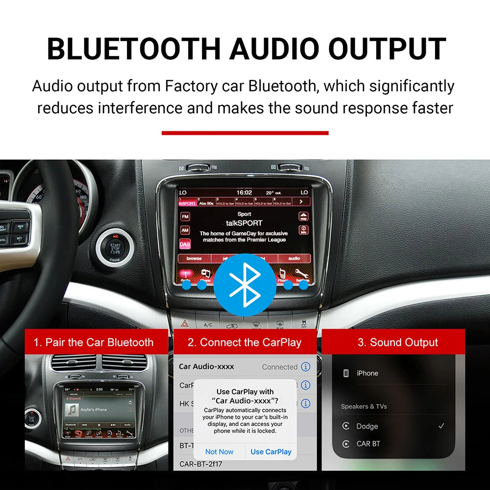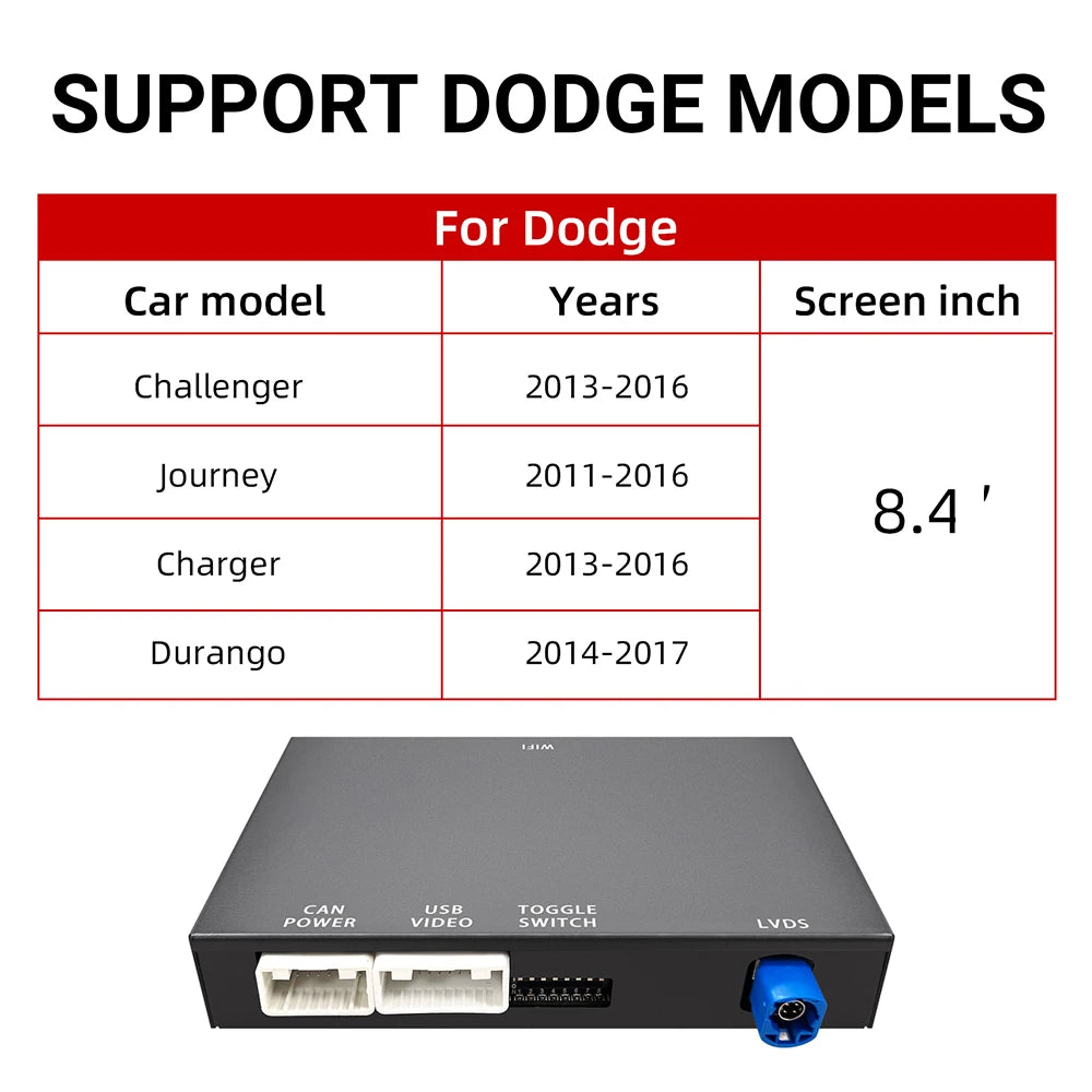 Detta retrofit-kit är speciellt utformat för Dodge Challenger, Journey, Charger och Durango-modeller utrustade med en 8,4" skärm. Det levererar en OEM-känsla av integration så att bilens interiör förblir bekant, men din teknik är radikalt förbättrad. Med inbyggt WiFi (2.4G/5.8G) och Bluetooth 5.0 kommer du att uppleva stabila anslutningar för navigation, samtal och media utan röran från kablar. Använd rattkontroller och pekinmatning (beroende på fordon) eller handsfree röstkommandon via “Hey Siri” för säkrare och mer bekväm drift.