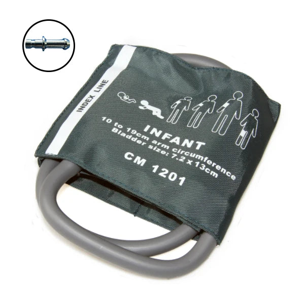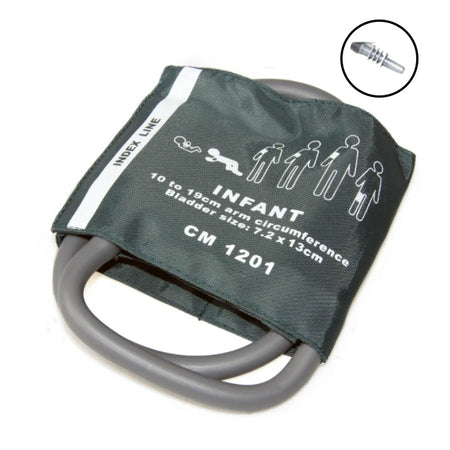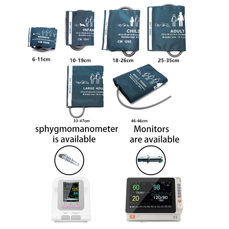 - Manschettstorlekar inkluderade: Nyfödd (6-11 cm); Spädbarn (10-19 cm); Barn (18-26 cm); Vuxen (25-35 cm); Stor (33-47 cm)