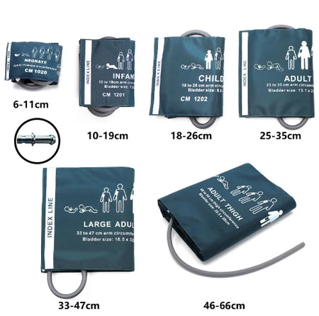 Finns i flera storlekar, inklusive Nyfödd (6-11 cm), Spädbarn (10-19 cm), Barn (18-26 cm), Vuxen (25-35 cm) och Stor (33-47 cm), gör detta set det enkelt att ha rätt manschett för varje patient. Korrekt manschettstorlek är avgörande för tillförlitliga blodtrycksmätningar, och detta mångsidiga set hjälper till att minimera mätfel orsakade av felpassande manschetter.