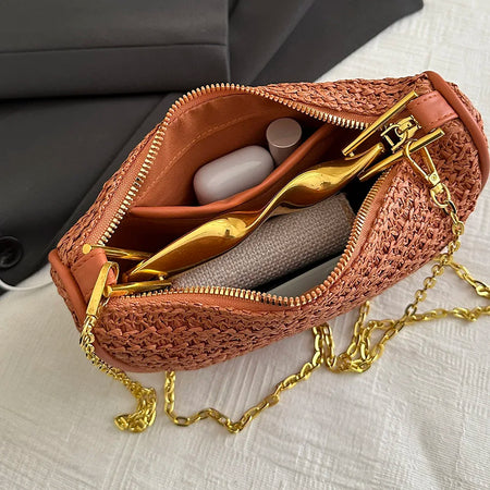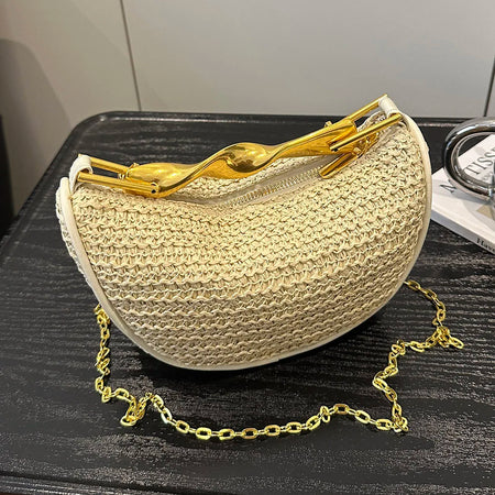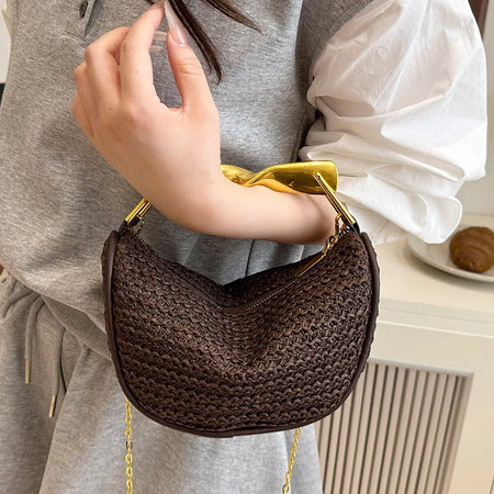 Elegant Stickning Crossbody Halmsäck Med Metallhandtag