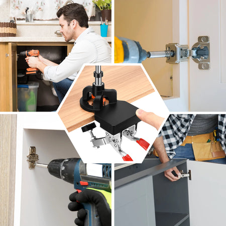 - Använd jiggen för exakt installation av 35mm dolda gångjärn på skåpsdörrar, vilket säkerställer enhetlig hålplacering över flera paneler.
