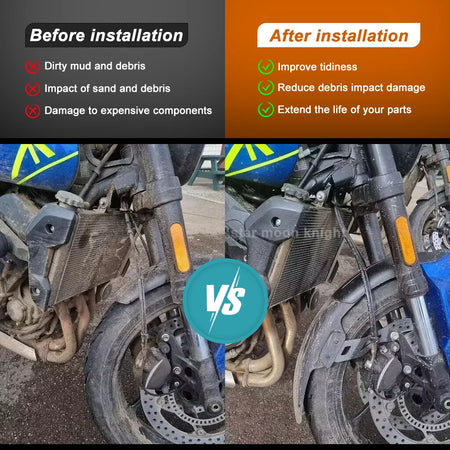 - Artı 25 cm koruma: ön çamurluğu uzatarak motosikletinizi ıslak veya tozlu koşullarda daha temiz tutar.