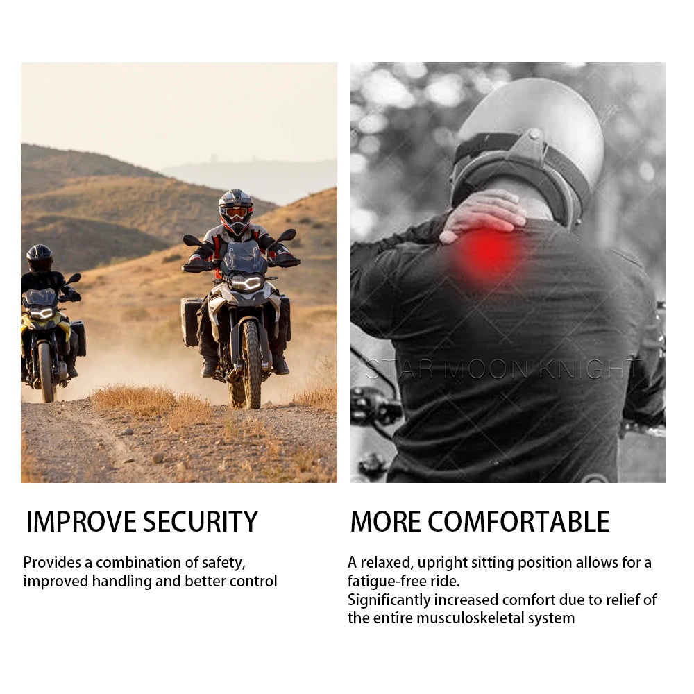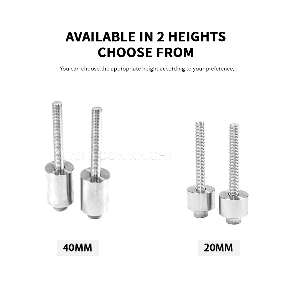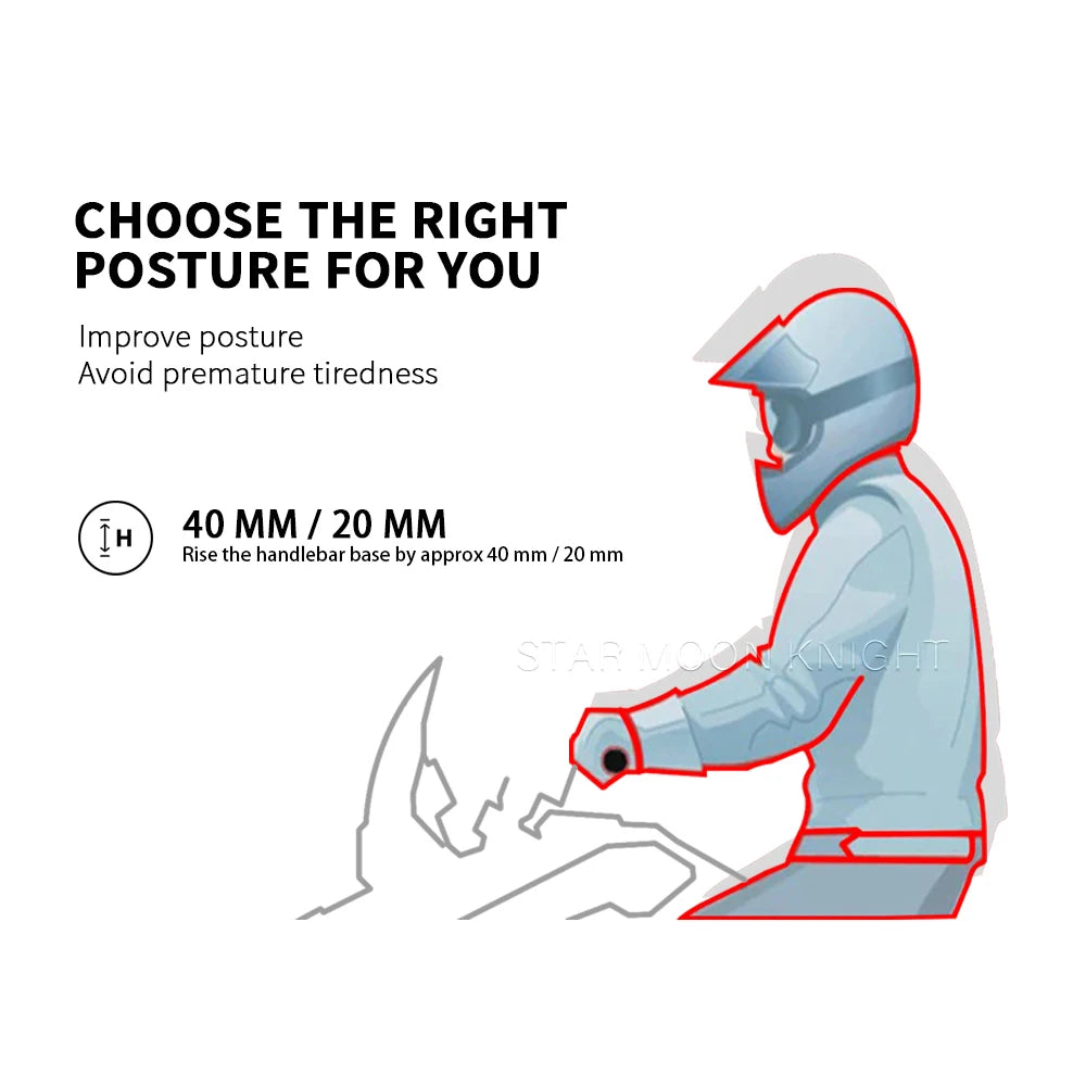 - İki yükseklik ayarı (20mm ve 40mm), uzun yolculuklarda konfor veya gerektiğinde daha agresif sürüş için sürüş pozisyonunu kişiselleştirmenizi sağlar.