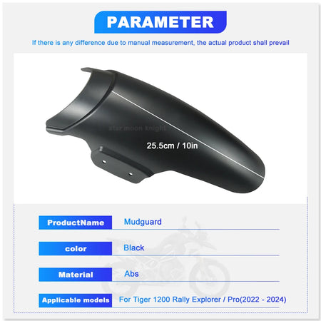 Star Moon Knight'tan Tiger 1200 Rally Explorer Ön Çamurluk Uzatması Splash'i tanıtıyoruz — 2022 Tiger 1200 Rally Pro ve Rally Explorer için tasarlanmış pratik bir çamurluk uzantısı. ABS ve karbon çelikten üretilen bu 25.5 cm (10.03 in) uzatma, ön koruyucunuzun konturunu takip ederek egzoz manifoltlarınızı, alt motorunuzu ve radyatörünüzü kir, taş ve sıçramadan korur. Lazer kesim braketler ve tüm montaj parçaları dahil olup, estetik veya açıklığı etkilemeden gerçek dünya koruması sağlar.