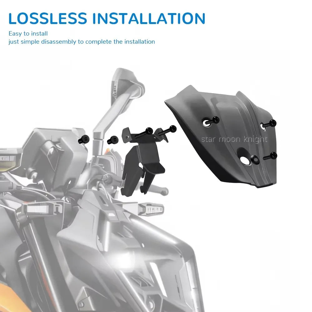 Paket, 990 Duke için yüksek kaliteli ABS'den enjeksiyon kalıplı Fly Screen içerir; keskin detay ve yüzey bitişi sağlar. Montaj braketleri alüminyumdan CNC işlenmiş ve dayanıklılık için siyah toz boyalıdır. Kurulum kayıpsız ve basittir, takip etmesi kolay resimli talimatlar sağlanmıştır.