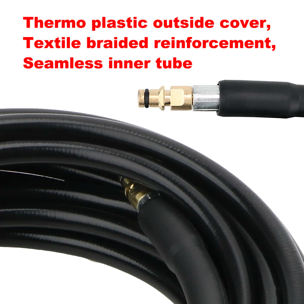 Pratik tasarım özellikleri, tutarlı ve güvenli temizlik sonuçları elde etmenize yardımcı olur. Hortum, kıvrılmalara ve aşınmaya karşı dirençli, tekstil takviyeli sağlam bir PE dış kaplama ve dikişsiz bir iç tüp kullanır. Maksimum çalışma basıncı 40 MPa (5800 PSI) ve 0°C ile 60°C arasındaki sıcaklık aralığı, çeşitli görevler ve hava koşulları boyunca güvenilir performans sağlar. 11.5 mm dış çap ve 1/4" (6.4 mm) iç çap, fazla çaba harcamadan kirleri kesen sürekli, güçlü püskürtme için akışı optimize eder.
