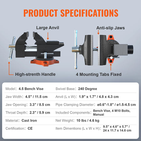 - Çeşitli görevler için çok yönlü sıkıştırma: Çok fonksiyonlu çene, 0.6 ila 1.8 inç (1.5 ila 4.5 cm) sıkıştırma çapı aralığı ile düz malzemeleri ve boruları tutar; bileme, taşlama ve kesme için uygundur.