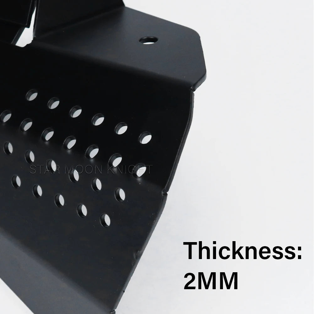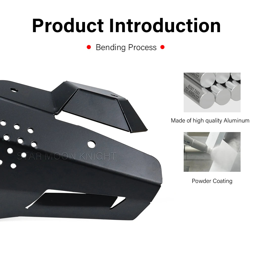Alüminyumdan üretilmiş ve siyah toz kaplama ile bitirilmiş koruyucu, 2 mm kalınlığında olup, kalıntılar, darbeler ve ısıya karşı sağlam bir bariyer sunarken soğutma için gerekli hava akışını korur. Hassas şekilde tasarlanmış kenarlar ve çok noktalı sabitleme, motosikletinizin tasarımıyla sorunsuz bütünleşen güvenli ve stabil bir uyum sağlar.