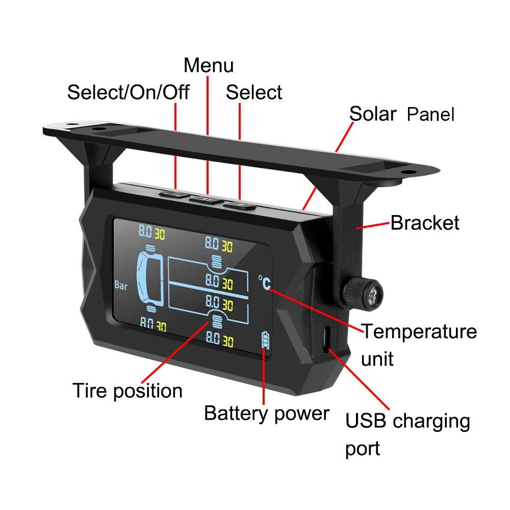 Yolda güvenilirlik için tasarlanan bu TPMS, çift enerji kaynağı olarak güneş enerjisi ve USB şarj kullanır. Bu, kurulum için ağır kablolama gerektirmediği ve kesintisiz izleme için sürekli bir güç kaynağı sağladığı anlamına gelir. Alıcı, yerleşik 1000mAh lityum iyon batarya barındırır ve altı sensörle 433.92MHz'de iletişim kurarak sistem genelinde doğru okumalar sağlar. Geniş bir mevsimsel çalışma aralığını destekler ve -20℃ ile 85℃ arasındaki sıcaklıkları yönetebilir, bu da onu çeşitli iklimler ve uzun yolculuklar için uygun hale getirir.