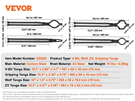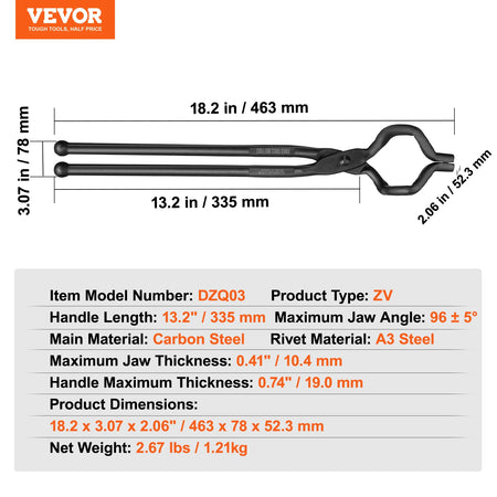 VEVOR Demirci Pense 18 İnç V-Kenar – Çok Fonksiyonlu Demirci — Çok yönlü metal işleme ve demirci görevleri için tasarlanmış ağır hizmet tipi 18" V-kenar demirci pense. Tutma, kontrol ve tekrar eden ısıtma döngüleri için inşa edilmiş bu kombinasyon pense, sıcak malzemeleri daha güvenli ve kolay bir şekilde kullanmayı sağlar.