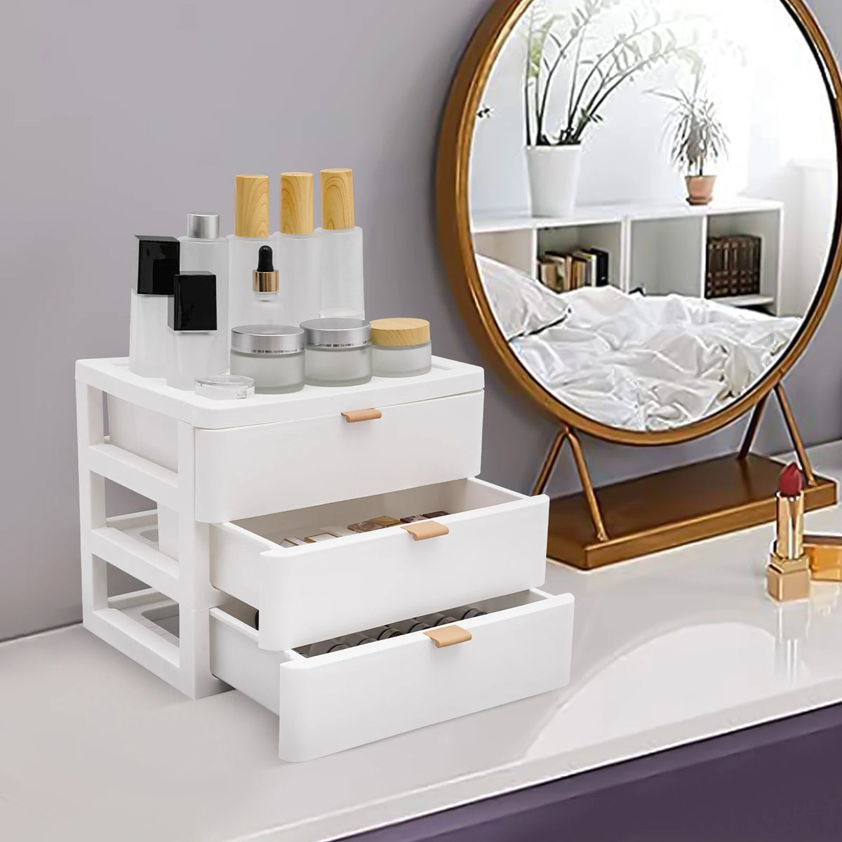 Beyaz Masa Üstü Düzenleyici – Üç Çekmeceli Depolama Çözümü: Çalışma alanınızı düzenlemek ve ofis malzemelerini, okul eşyalarını ve kozmetikleri düzenli bir şekilde saklamak için tasarlanmış kompakt, temiz hatlı bir masa üstü düzenleyici. Üç çekmeceli düzen ve üst platform, kolay erişim ve düzenli sunum için dikey alanı maksimize eder.